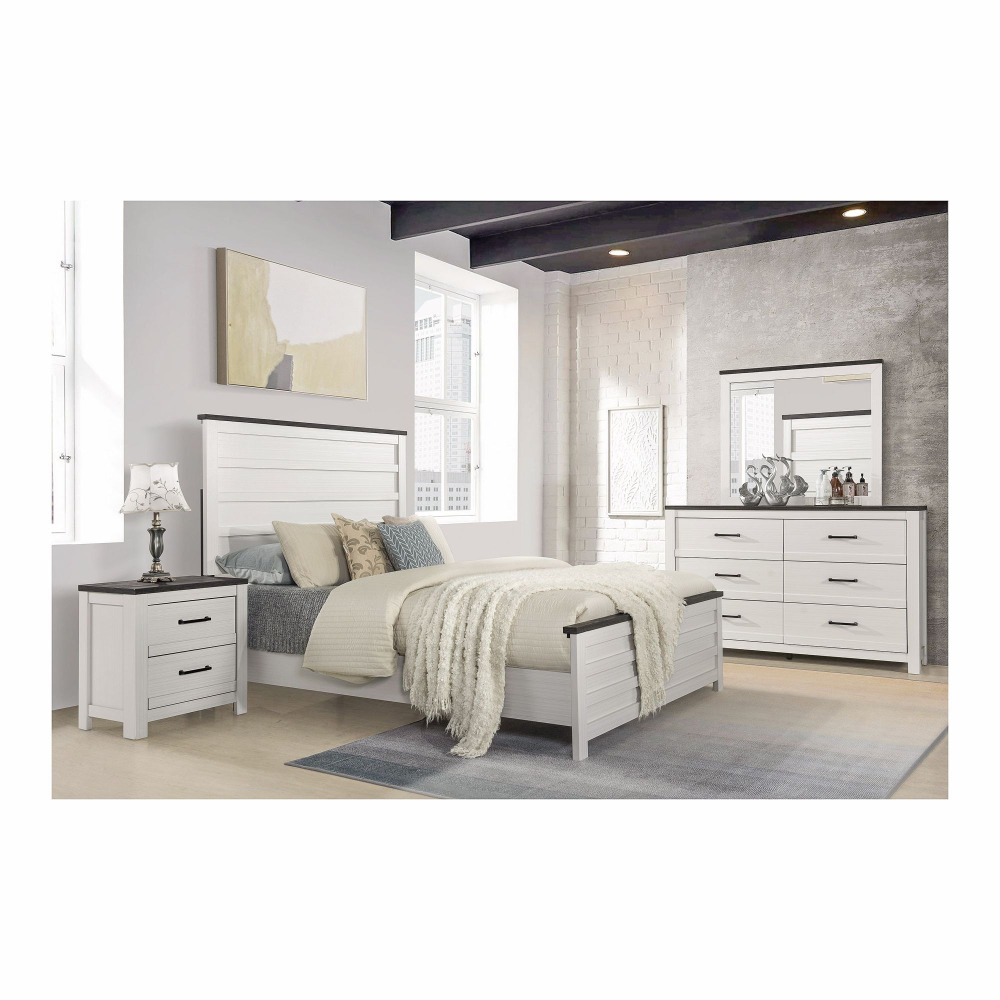 Farmhouse meets luxury. This chic farmhouse design has old meet new. The two-tone finish of warm white bodies with rustic finish tops and barn-like metal handles gives this bedroom the perfect updated farmhouse look. The cases and bed feature a fence-like design to complement the farmhouse look. All the pieces are raised off the floor to make it easy to clean under. The oversized mirror and headboard are the finishing touches on a great bedroom.
