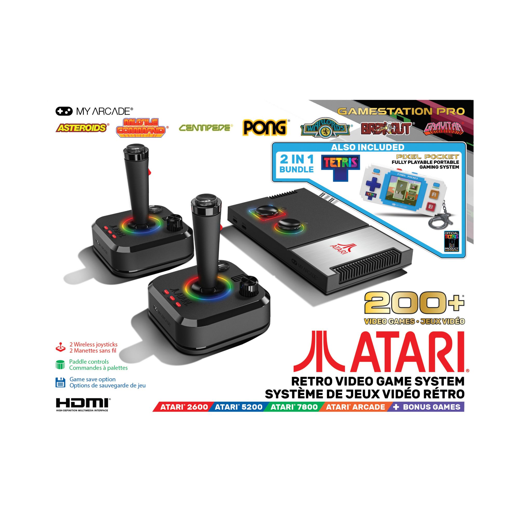 Includes Atari Gamestation Pro console, two joysticks with paddles, HDMI cable, power cable and user guide