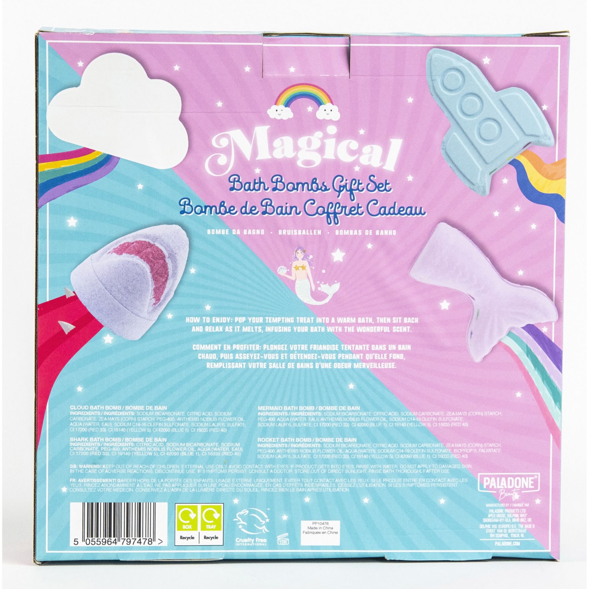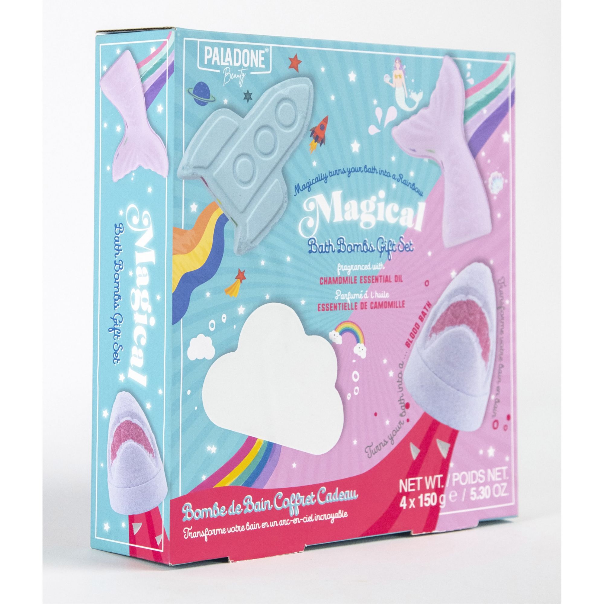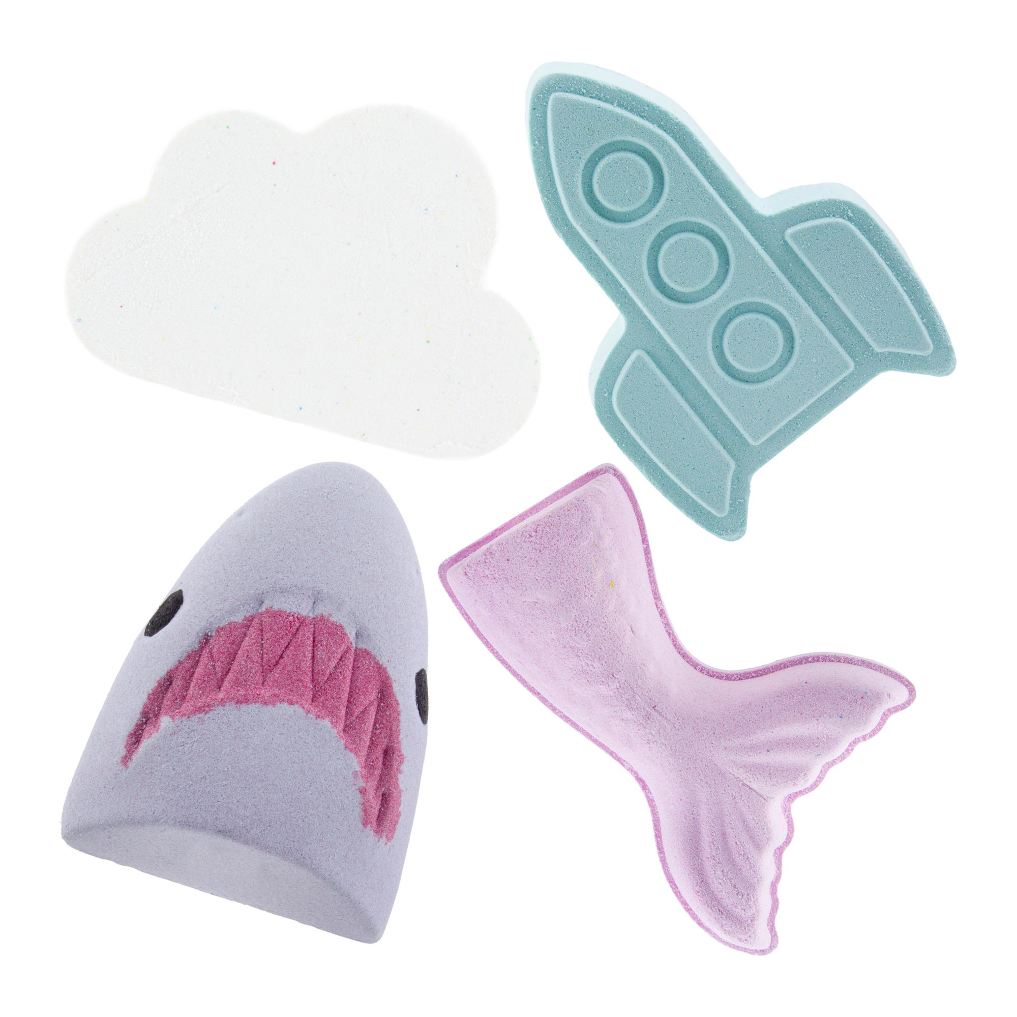 Cloud bath bomb, mermaid bath bomb, shark bath bomb, rocket bath bomb Magically turns your bath into a rainbow Set of four 150g (5.3 oz.) bath bombs Chamomile fragrance This product is approved under the Leaping Bunny program