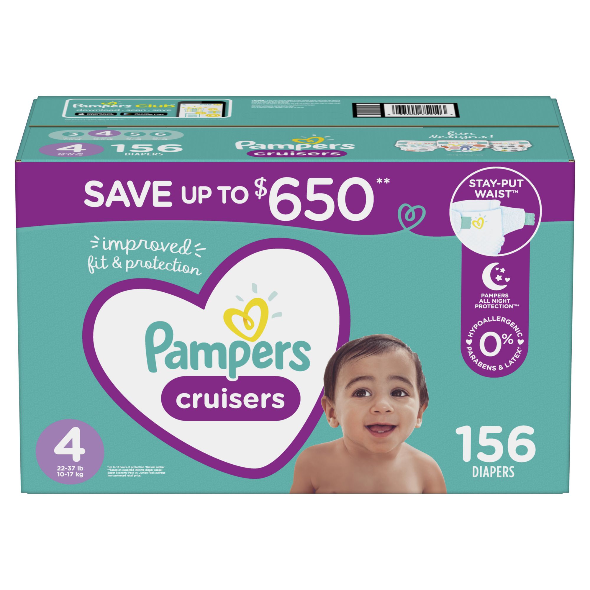 Pampers Cruisers has long-lasting fit and trusted protection for the most active babies 2x stretchier sides* for a fit that stays put *Vs. the leading moving baby sub-brand New and improved* dual leak-guard barriers prevent leaks where they happen most *Sizes 3 & 4 Available in a variety of wild and playful prints Pampers All Night Protection helps stop leaks for up to 12 hours Fit Guide for a more customized fit Made with hypoallergenic materials, without parabens and latex* *Natural rubber