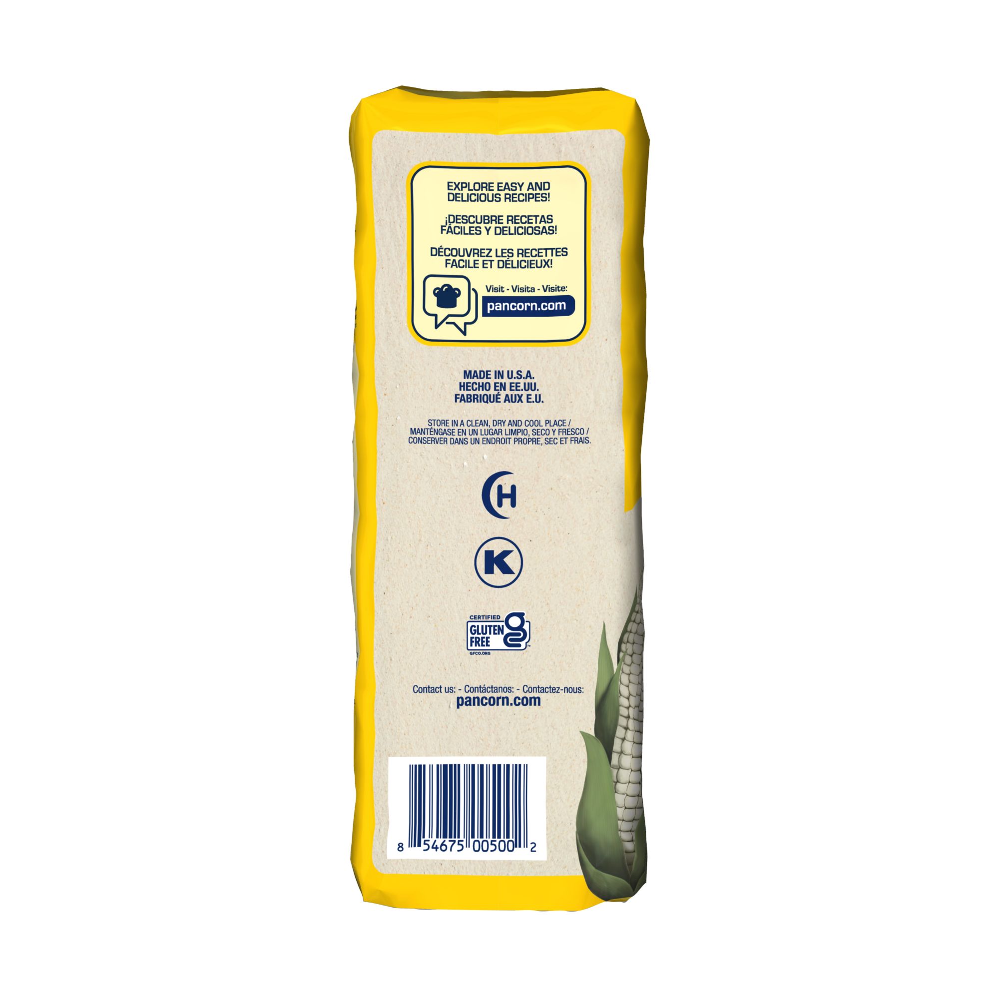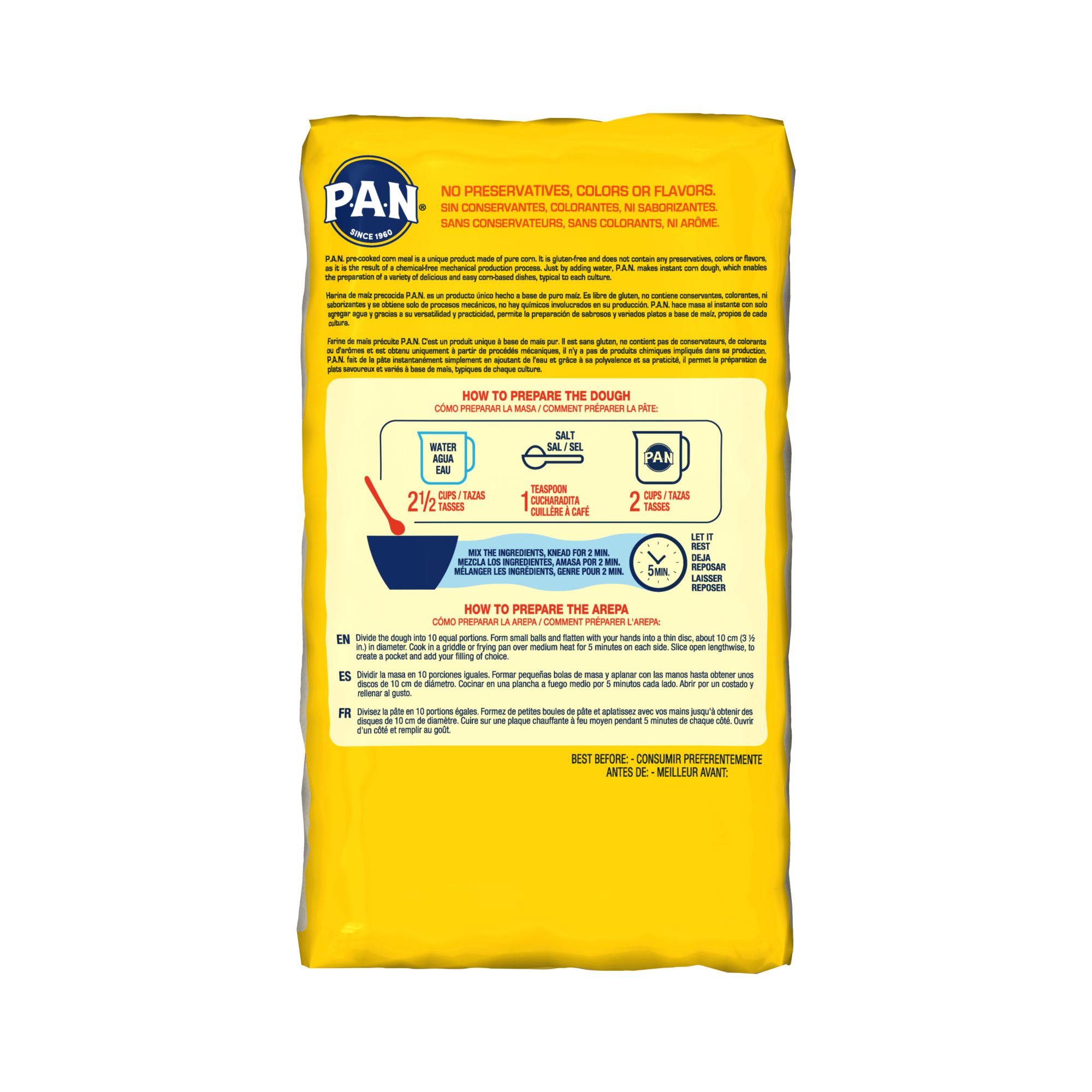 The precooked white corn meal P.A.N., is a product obtained from the endosperm of the grain of corn (Zea mays L) classified for human consumption, this is subject to a process of cleaning, degerminating, precooked, and milling. The precooking is a thermal and mechanical process to achieve the gelatinization of the starch, which gives the finished corn meal the ability to absorb water and form dough Pre-cooked corn flour is enriched with niacin, thiamin riboflavin, folic acid and iron (in accordance with 21 CFR 137.260). The precooked corn meal odor and taste characteristics can be fresh, neutral, roasted, or that of stored corn. The packaging material is made with bioriented polypropylene (BOPP) and a clear opening polyethylene (PE) sealing layer. Each of the materials that make up the structure and the plant where it is manufactured, have FDA approvals . P.A.N. pre-cooked corn meal is a unique product made of pure corn. It is certified gluten-free and does not contain any preservatives, colors, or flavors, as it is the result of a chemical-free mechanical production process. Just by adding water, P.A.N. makes instant corn dough, which enables the preparation of a variety of delicious and easy corn-based dishes, typical to each culture. P.A.N. Precooked White Corn Meal has a 12-month shelf life.
