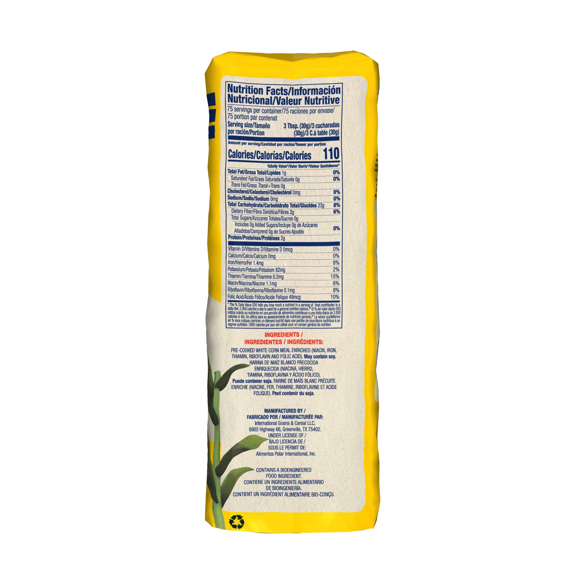 Ingredients:Pre-cooked White Corn Meal Enriched (Niacin, Iron,Thiamin, Riboflavin And Folic Acid).