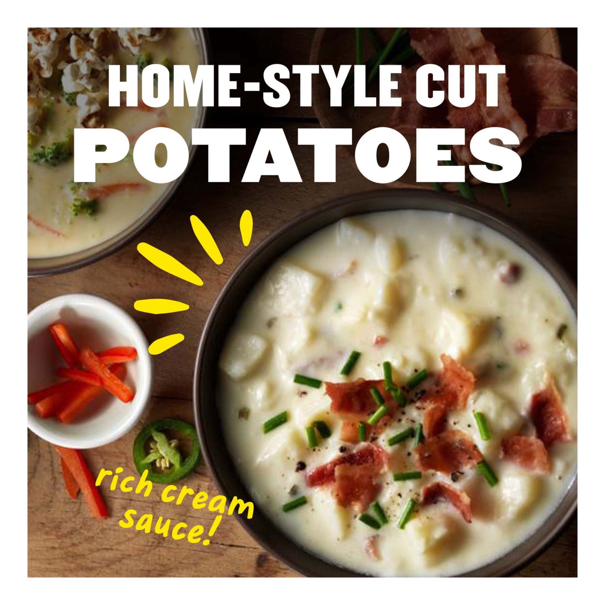 Combines homestyle cuts of potatoes simmered with select seasonings and smoked uncured bacon in a rich cream sauce