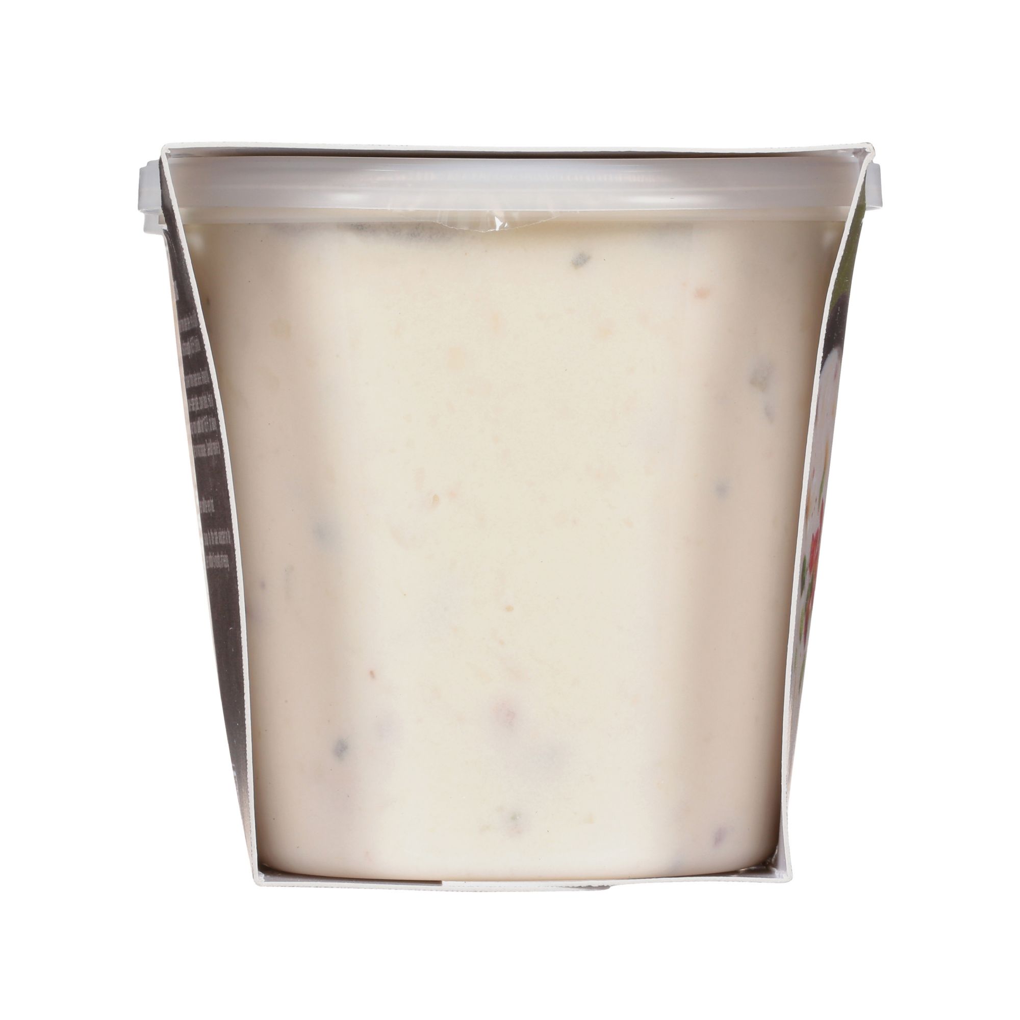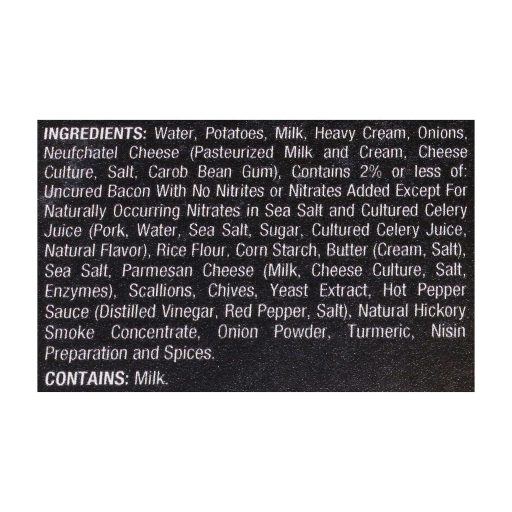Ingredients: Water, Potatoes, Milk, Heavy Cream, Onions, Neufchatel Cheese (Pasteurized Milk and Cream, Cheese Culture, Salt, Carob Bean Gum), Contains 2% or Less of: Uncured Bacon with No Nitrites or Nitrates Added Except for Naturally Occurring Nitrates in Sea Salt and Cultured Celery Juice (Pork, Water, Sea Salt, Sugar, Cultured Celery Juice, Natural Flavor), Rice Flour, Corn Starch, Butter (Cream, Salt), Sea Salt, Parmesan Cheese (Milk, Cheese Culture, Salt, Enzymes), Scallions, Chives, Yeast Extract, Hot Pepper Sauce (Distilled Vinegar, Red Pepper, Salt), Natural Hickory Smoke Concentrate, Onion Powder, Turmeric, Nisin Preparation and Spices.