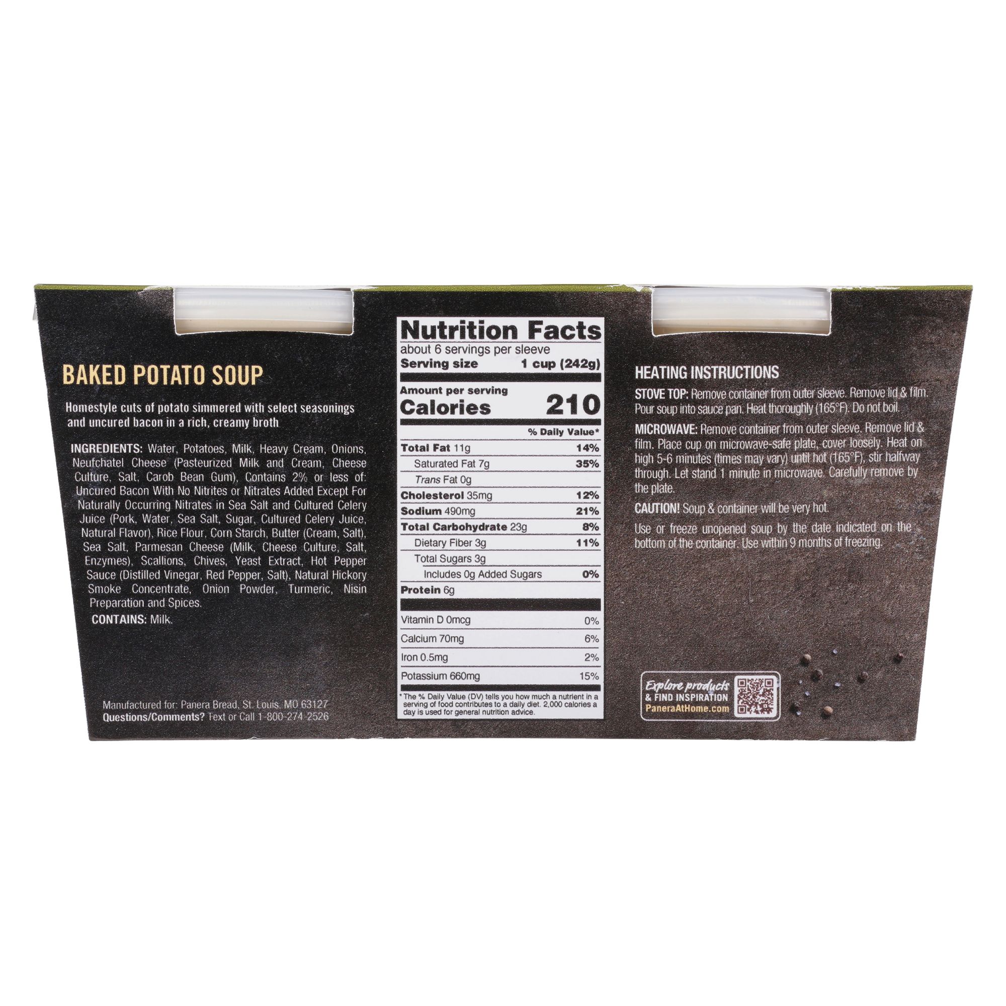 Panera Baked Potato Soup delivers a bakery-cafe inspired favorite in a microwavable cup that you can take with you on-the-go. Featuring homestyle cuts of potatoes, this packaged soup combines select seasonings with smoked uncured bacon in a rich cream sauce. Whether you have a busy schedule and need a quick meal or you just want to enjoy a warm cup of soup, this Panera soup is perfect any time of day. To cook, remove the lid and film and place in the microwave, covering loosely. Heat this microwave soup cup on high for 5 to 6 minutes and stir halfway through. You can also cook this soup on the stove top to 165 degrees F, but do not boil. Store this Baked Potato soup cup in the refrigerator until you are ready to prepare. Make easy, craveable meals with help from Panera Bread at home.