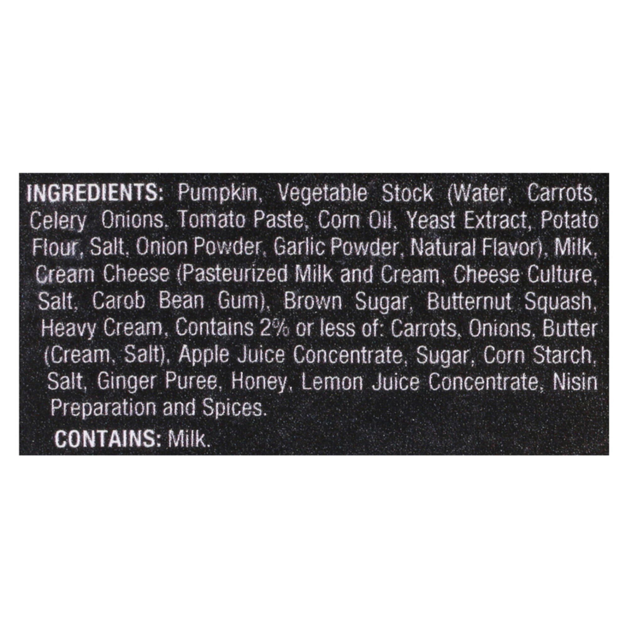 Ingredients: Pumpkin, Vegetable Stock (Water, Carrots, Celery, Onions, Tomato Paste, Corn Oil, Yeast Extract, Potato Flour, Salt, Onion Powder, Garlic Powder, Natural Flavor), Milk, Cream Cheese (Pasteurized Milk and Cream, Cheese Culture, Salt, Carob Bean Gum), Brown Sugar, Butternut Squash, Heavy Cream, Contains 2% or Less of: Carrots, Onions, Butter (Cream, Salt), Apple Juice Concentrate, Sugar, Corn Starch, Salt, Ginger Puree, Honey, Lemon Juice Concentrate, Nisin Preparation and Spices.