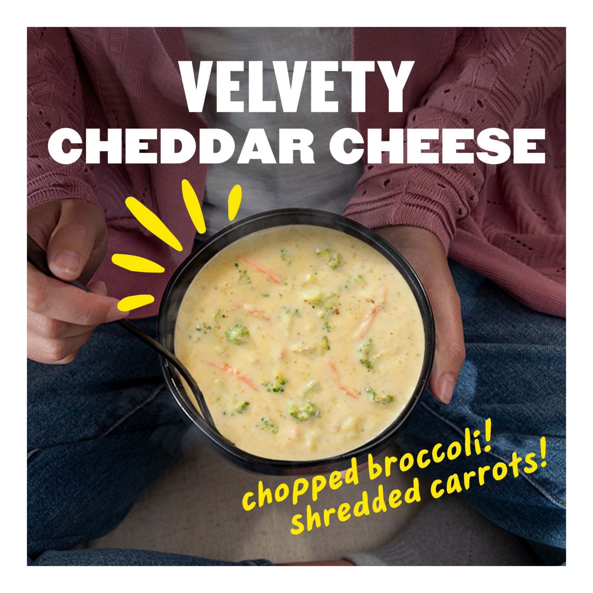 Thick soup that is made with chopped broccoli and shredded carrots and simmered with select seasonings in a velvety smooth cheese sauce