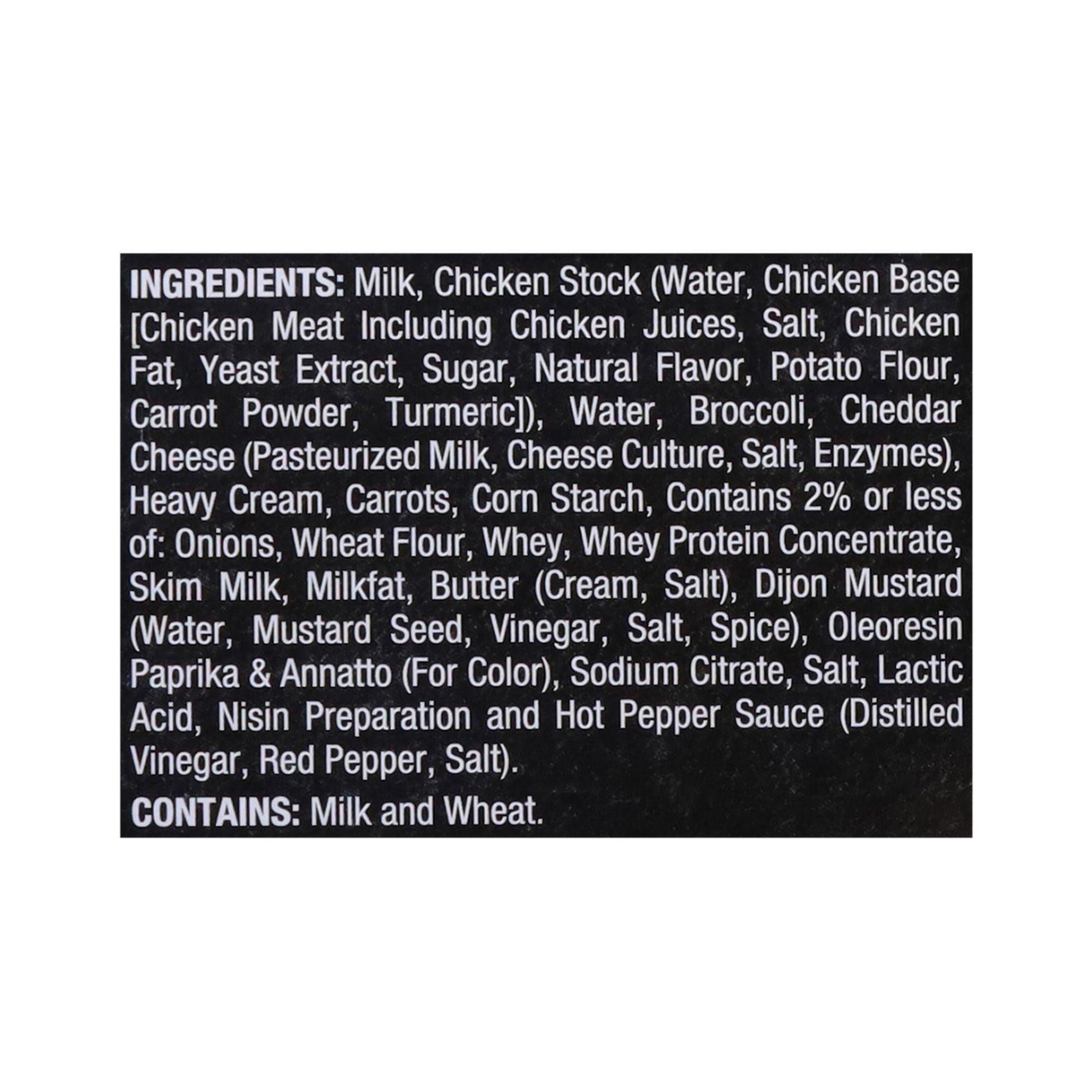 Milk, Chicken Stock (Water, Chicken Base [Chicken Meat Including Chicken Juices, Salt, Chicken Fat, Yeast Extract, Sugar, Natural Flavor, Potato Flour, Carrot Powder, Turmeric]), Water, Broccoli, Cheddar Cheese (Pasteurized Milk, Cheese Culture, Salt, Enzymes), Heavy Cream, Carrots, Corn Starch, Contains 2% or Less of: Onions, Wheat Flour, Whey, Whey Protein Concentrate, Skim Milk, Milkfat, Butter (Cream, Salt), Dijon Mustard (Water, Mustard Seed, Vinegar, Salt, Spice), Oleoresin Paprika & Annatto (for Color), Sodium Citrate, Salt, Lactic Acid, Nisin Preparation and Hot Pepper Sauce (Distilled Vinegar, Red Pepper, Salt).