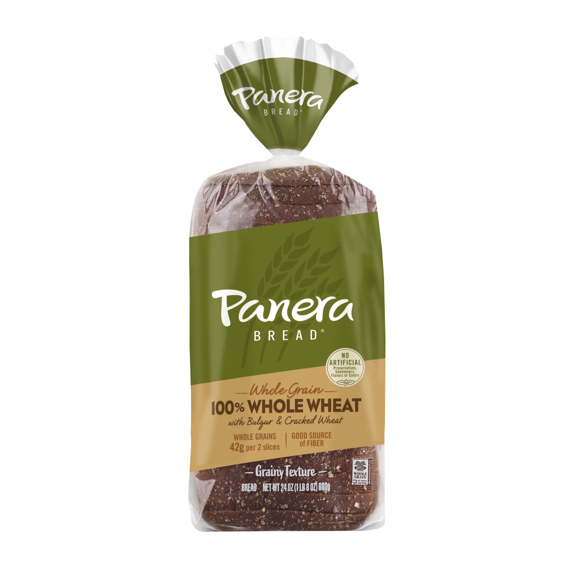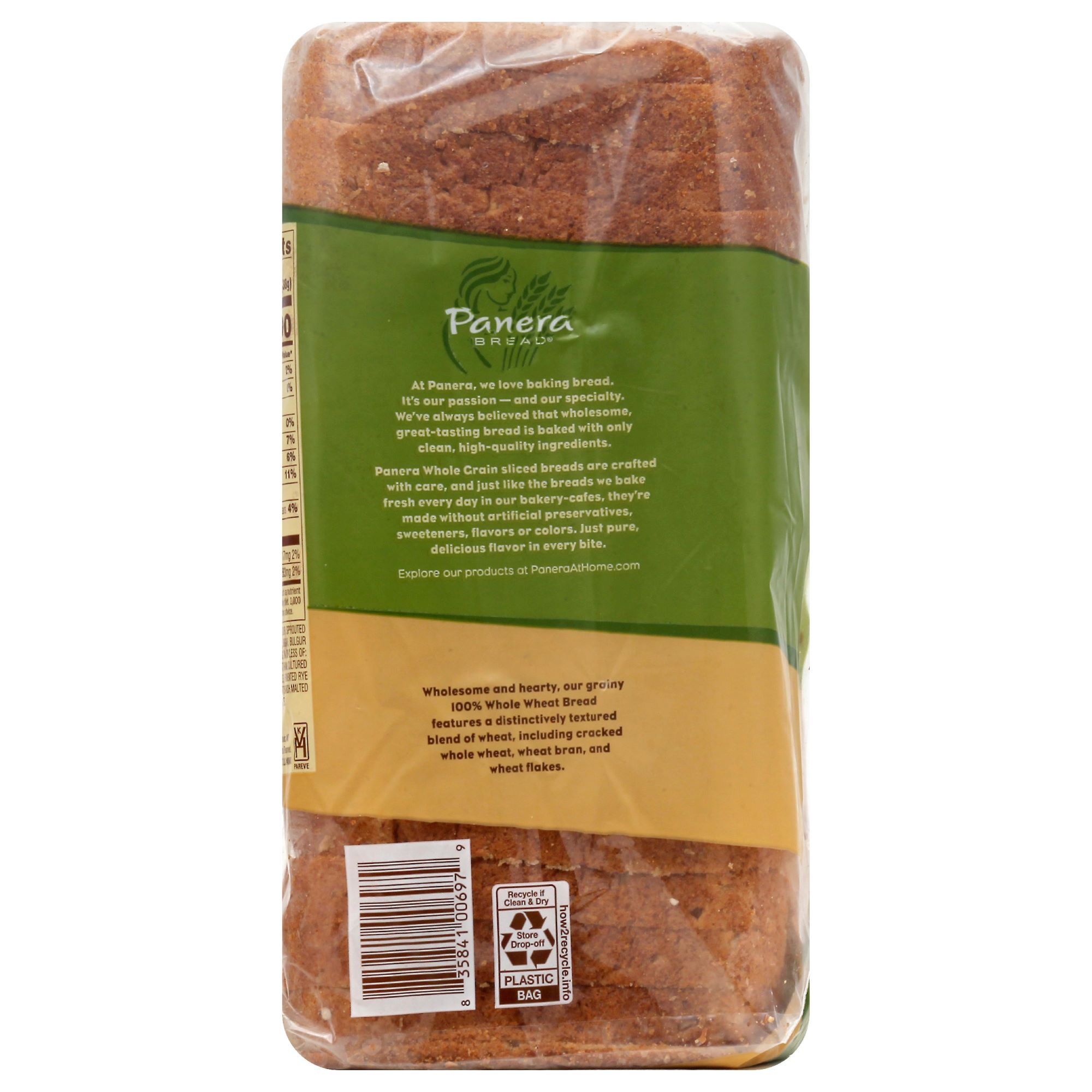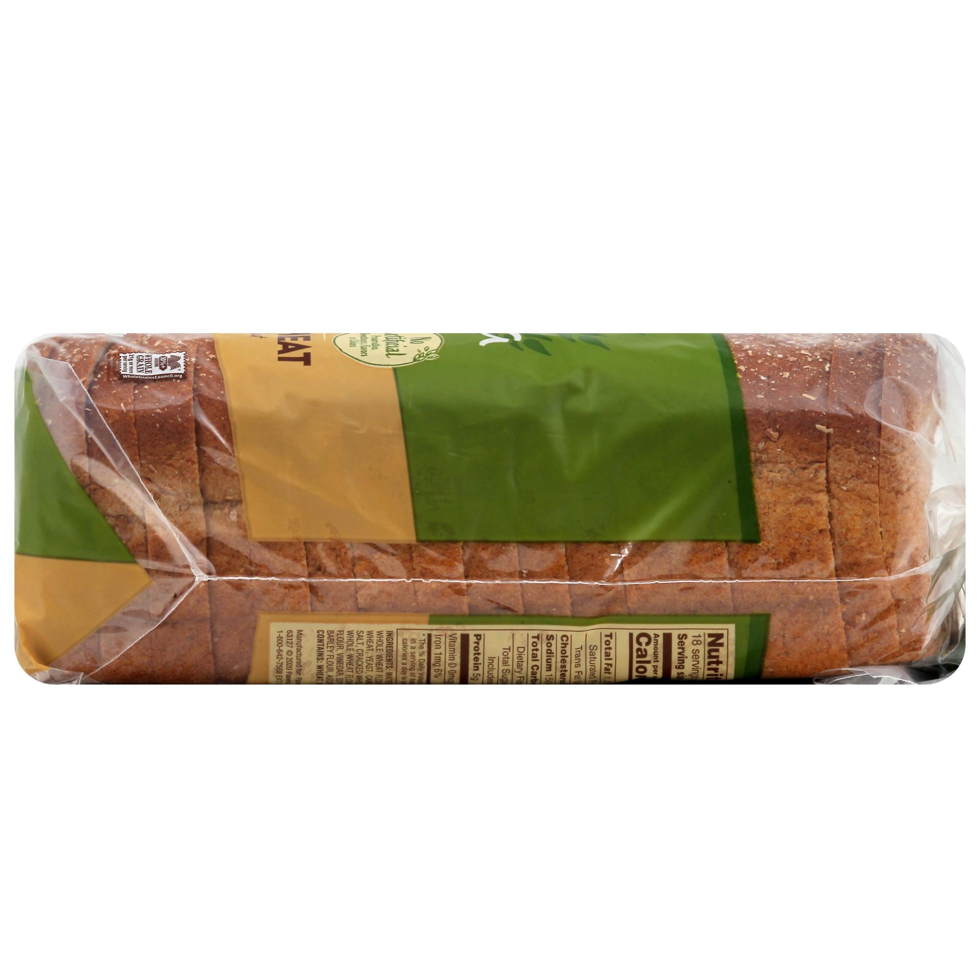 Panera 100% Whole Wheat Bread offers a classic grainy bread that is perfect for toasting or making sandwiches. This sliced wheat bread is made with a distinctively textured blend of wheat, including cracked whole wheat, wheat bran, and wheat flakes. This loaf of bread comes pre-sliced with 18 slices for easy meal prep. Made with no artificial preservatives, sweeteners, flavors or colors from artificial sources, this dairy free bread is also vegetarian. Use this whole grain wheat bread for breakfast toast, pile on deli meat and cheese for a tasty lunch or add a piece of this soft wheat bread to your dinner plate to complete the meal. Store this sliced bread in a cool, dry place or in the freezer up to six months for a longer shelf life.