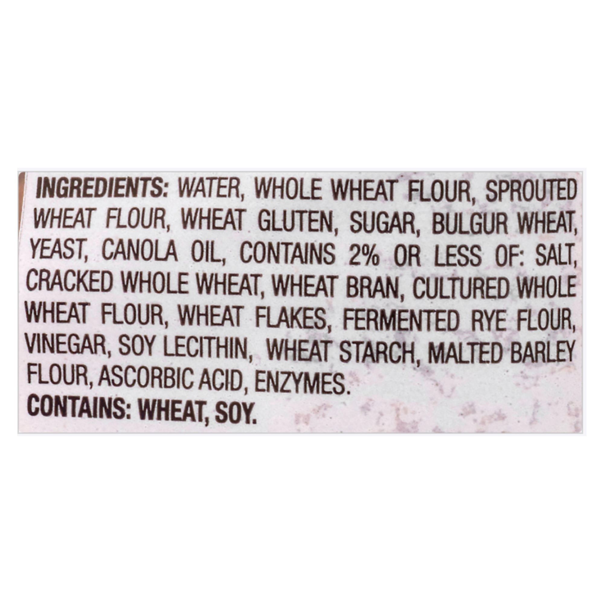 Ingredients Water, Whole Wheat Flour, Sprouted Whole Wheat Flour, Wheat Gluten, Sugar, Bulgur Wheat, Yeast, Canola Oil, Contains 2% or less of: Salt, Cracked Whole Wheat, Wheat Bran, Cultured Whole Wheat Flour, Wheat Flakes, Fermented Rye Flour, Vinegar, Soy Lecithin, Wheat Starch, Malted Barley Flour, Ascorbic Acid, Enzymes.