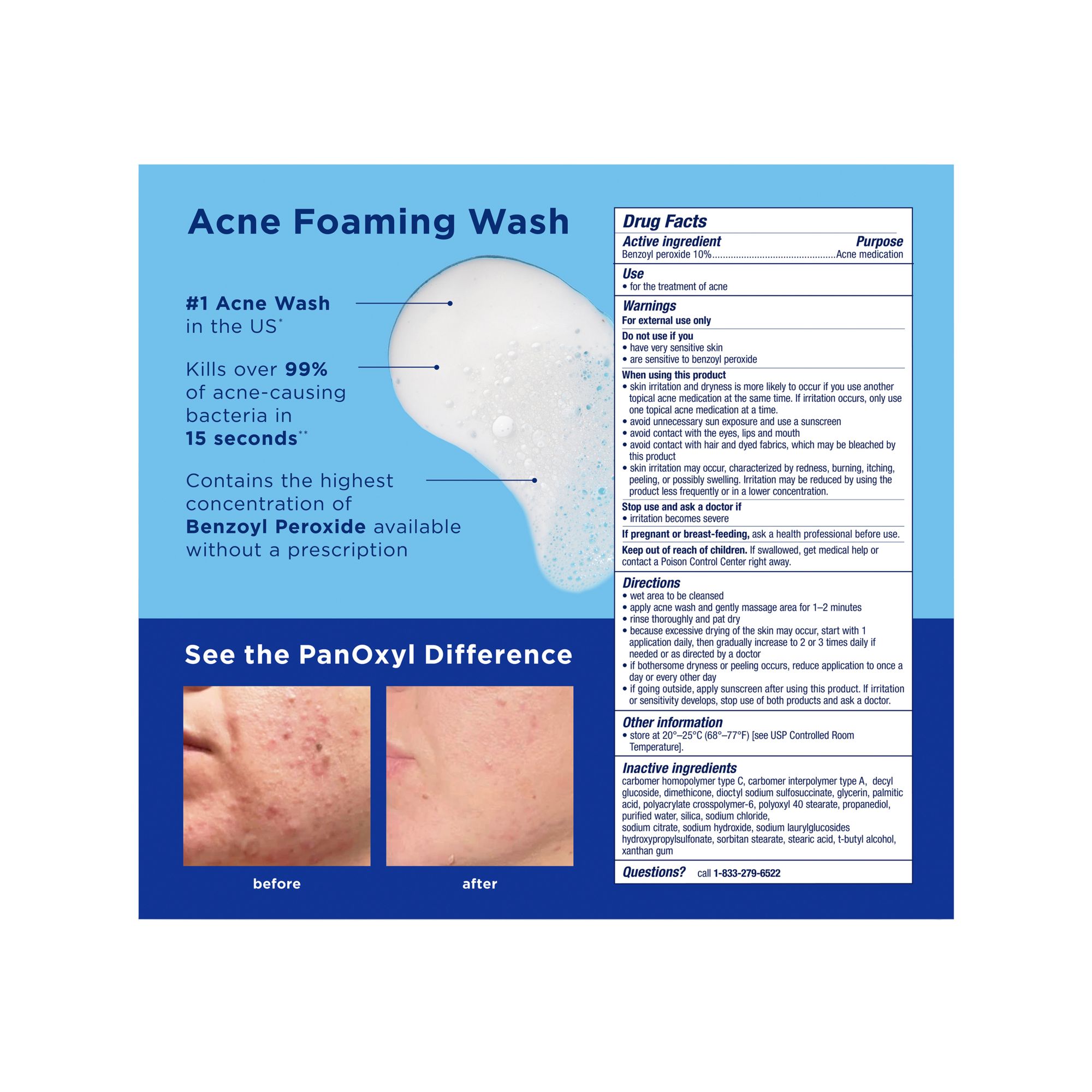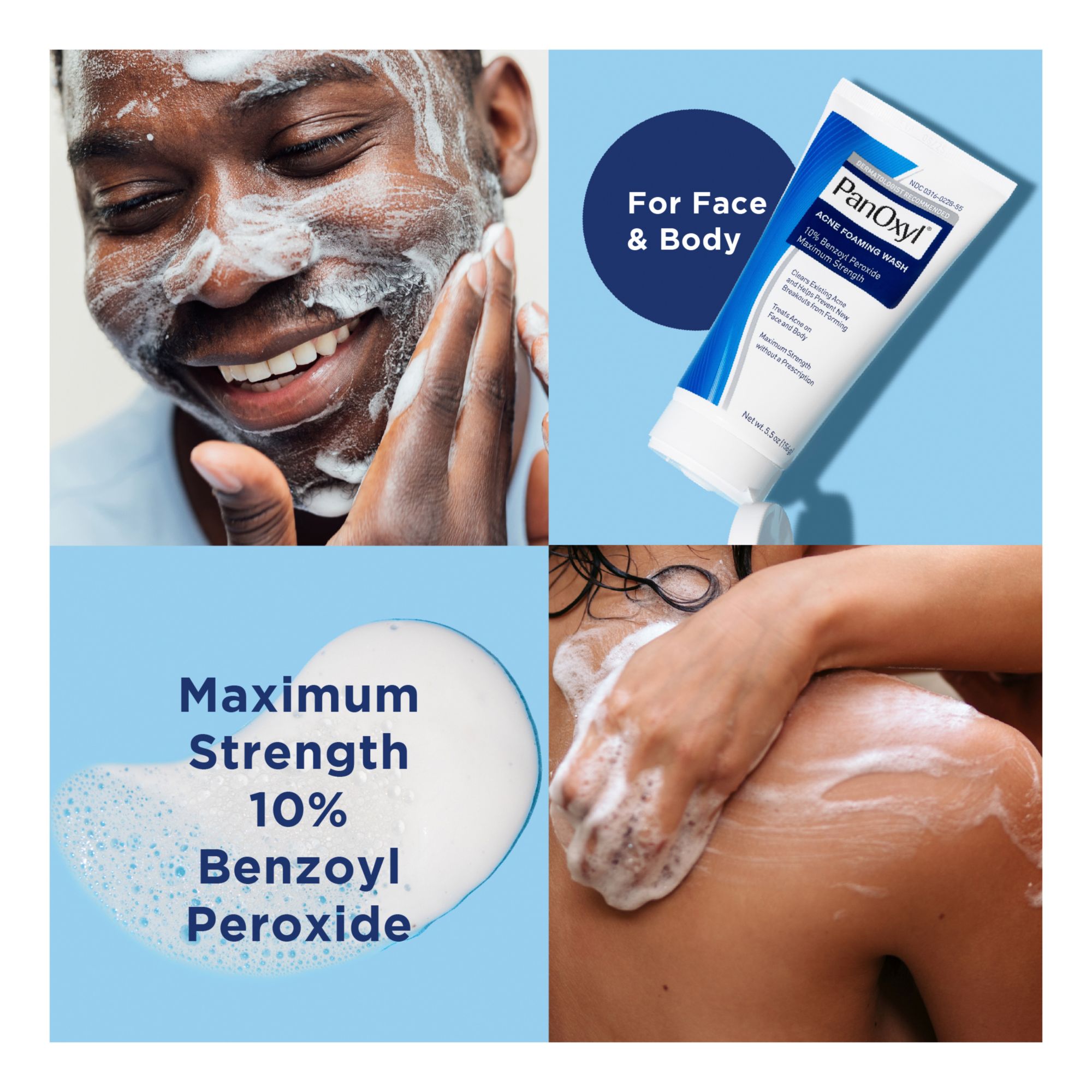 Clear, treat and prevent even the worst breakouts with PanOxyl 10% Benzoyl Peroxide Maximum Strength Acne Foaming Wash. This cleanser for acne-prone skin can be used on both the face and body. PanOxyl Acne Foaming Wash contains the highest concentration of benzoyl peroxide available without a prescription. This powerful daily cleanser starts working quickly to clear inflammatory acne and kills over 99% of acne-causing bacteria in 15 seconds.* Acne treatments can be harsh and drying to skin, so PanOxyl’s benzoyl peroxide washes contain moisturizers to combat dryness. PanOxyl Benzoyl Peroxide Acne Foaming Wash clears and treats existing breakouts and helps prevent new zits from forming in one step.
