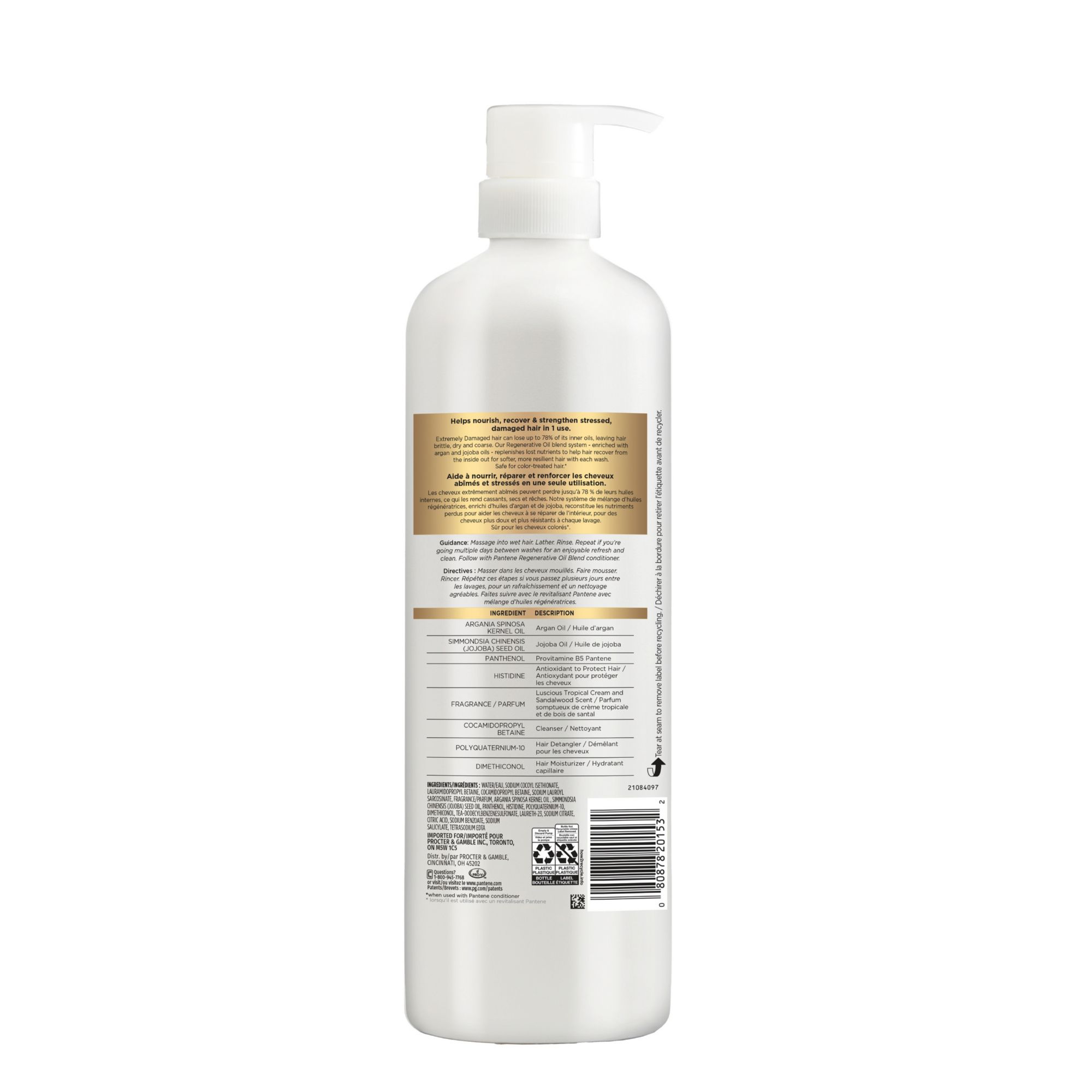 Helps nourish, recover and strengthen stressed, damaged hair in one use. Salon size - 2X more* *vs. 13.5 oz shampoo. Extremely damaged hair can lose up to 78% of its inner oils, leaving hair brittle, dry and coarse. Pantene's Regenerative Oil blend system - enriched with argan and jojoba oils - replenishes lost nutrients to help hair recover from the inside out for softer, more resilient hair with each wash. Safe for color-treated hair.** Luxury hair repair without the $60 price tag. Directions: Massage into wet hair. Lather. Rinse. Repeat if you’re going multiple days between washes for an enjoyable refresh and clean. Follow with Pantene Extreme Damage Care Regenerative Oil Blend conditioner.**when used with Pantene conditioner. Create more great days. Which is why Pantene is committed to making the best possible hair care - safe and effective - in the best possible way. Since 1945, when Swiss doctors first discovered the nurturing, hair-boosting benefits of Pantene’s Pro-Vitamin B5, they’ve made healthy hair a reality for hundreds of millions of people around the globe.