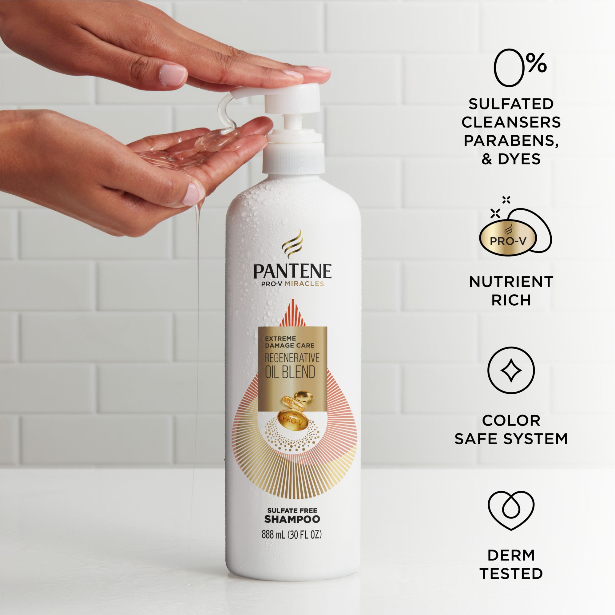 Includes one (1) Pantene Pro-V Miracles Extreme Damage Care Regenerative Oil Blend Sulfate-Free Shampoo, 30 fl. oz.