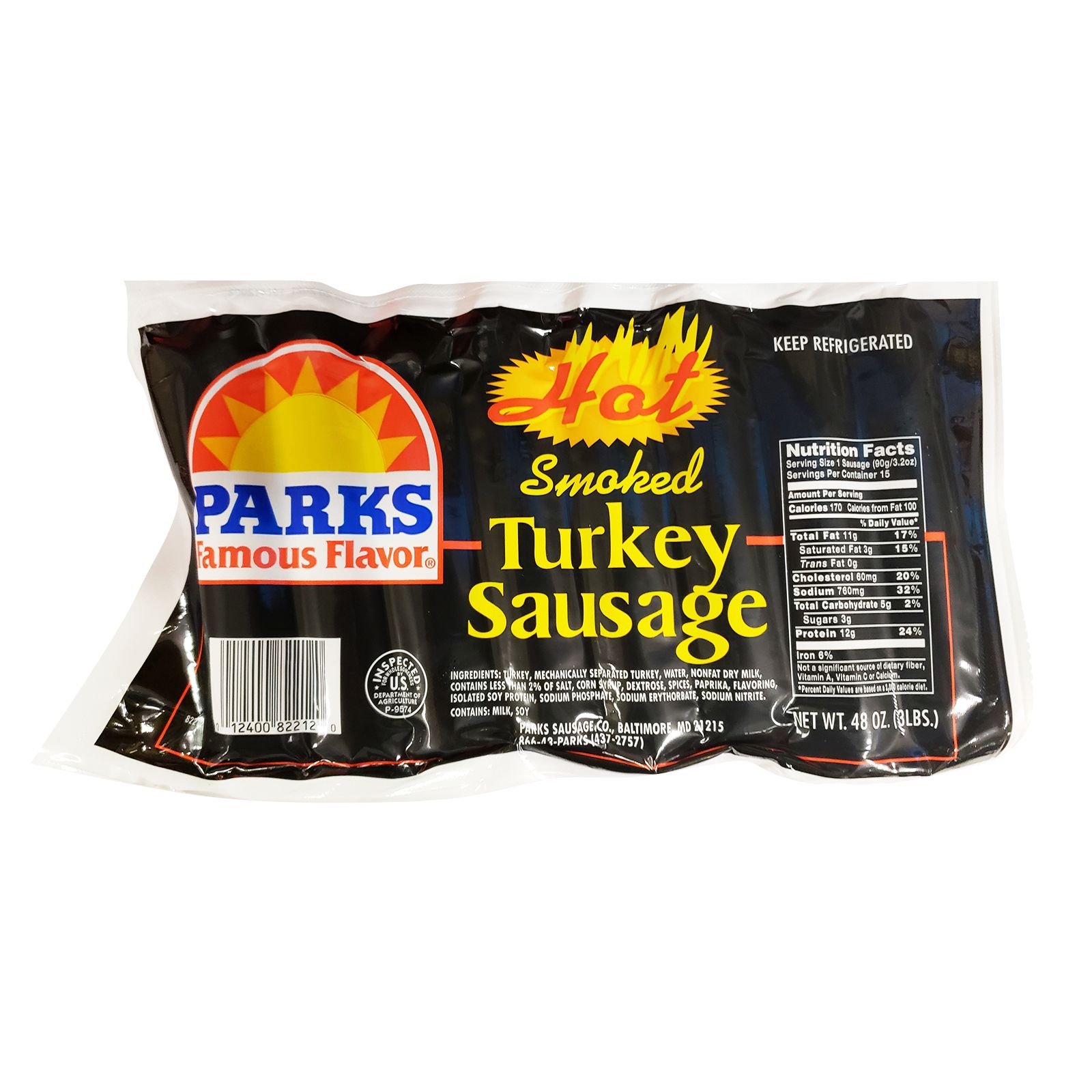 Includes Parks Hot Smoked Sausage, 3 lbs., 16 links, 3 oz. links