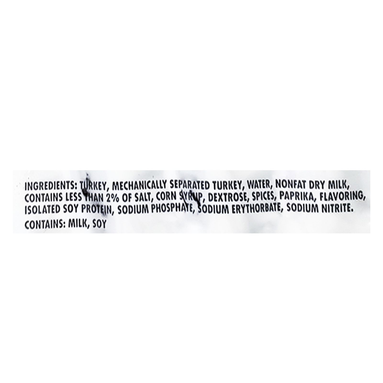 Turkey, Mechanically Seperated Turkey, Water, Nonfat Dry Milk, Contains Less Than 2% of Salt, Corn Syrup, Dextrose, Spices, paprika, Flavoring, Isolated Soy Protein, Sodium Phosphate, Sodium Erythrobate, Sodium Nitrite. Contains: Milk, Soy