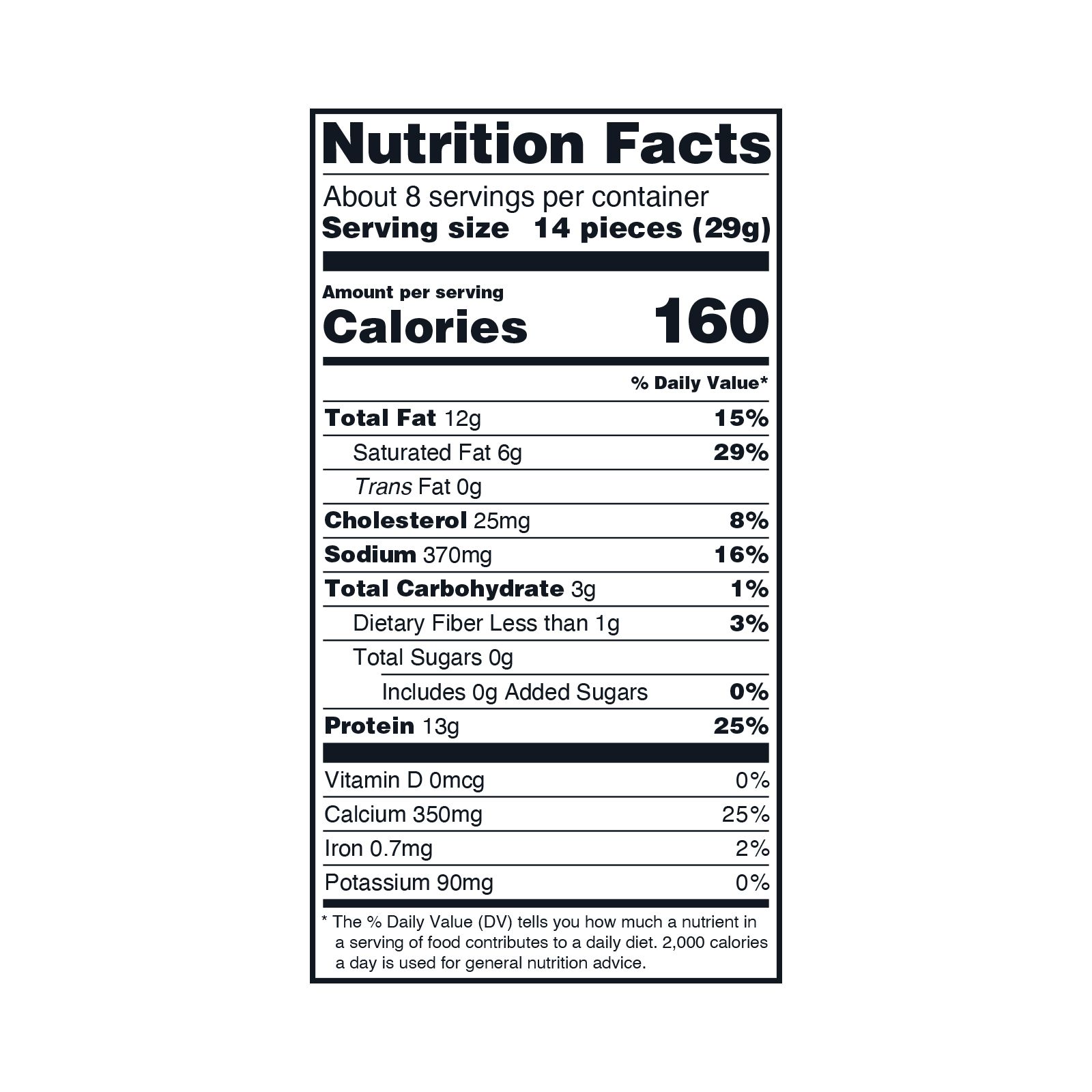 Ingredients: Cheese (Cultured Milk, Salt, Enzymes), Parmesan Cheese (Cultured Milk, Salt, Enzymes), Sunflower Seeds, Pumpkin Seeds, Whole Brown Flaxseed, Black Pepper.