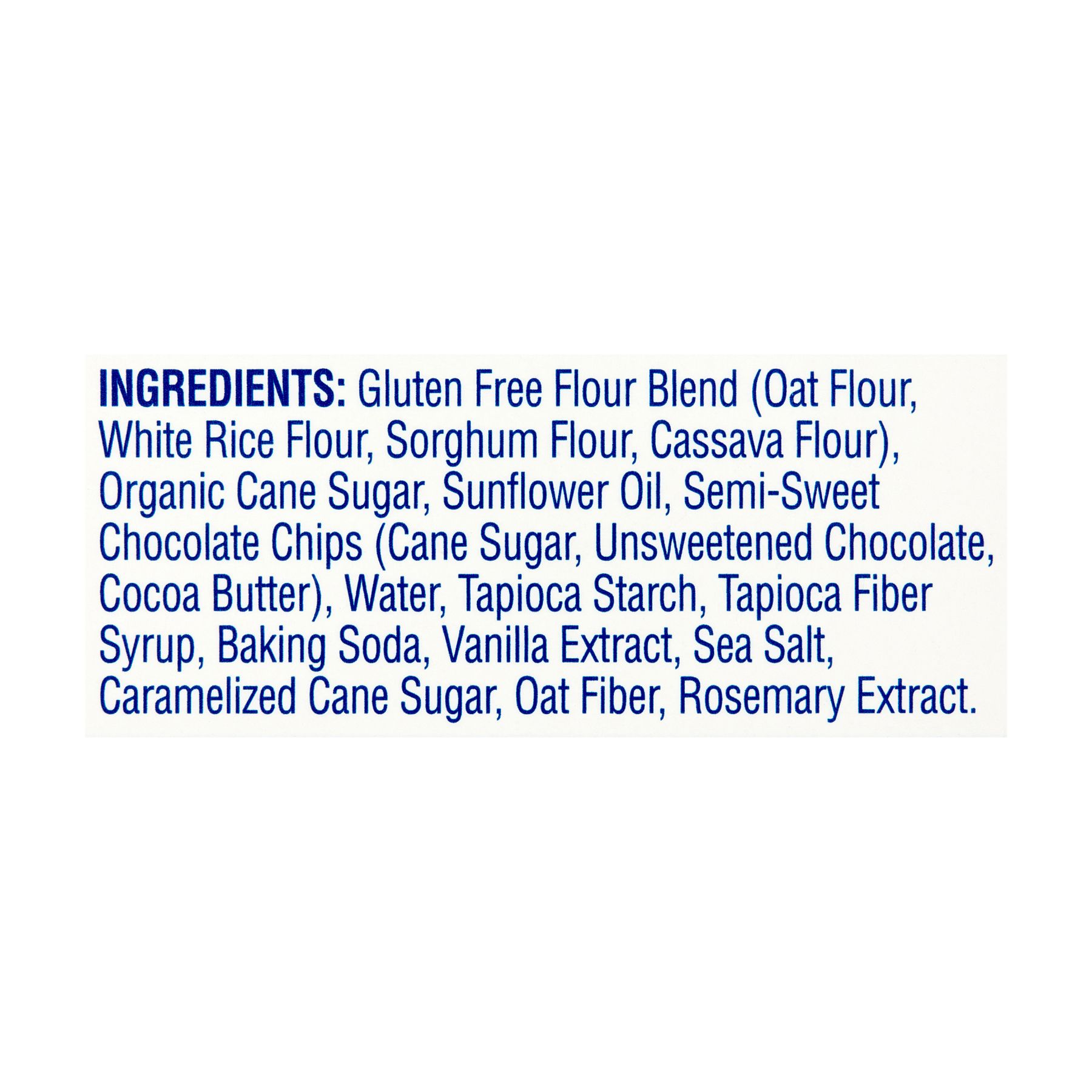 Ingredients: Gluten Free Flour Blend (Organic Light Buckwheat Flour, Gluten Free Oat Flour, Cassava Flour, Tapioca Flour), Organic Fair Trade Cane Sugar, Non-Gmo Sunflower Oil, Semi-Sweet Chocolate Chips (Cane Sugar, Unsweetened Chocolate, Cocoa Butter), Gluten Free Oats, Water, Tapioca Starch, Tapioca Fiber Syrup, Vanilla Extract, Sea Salt, Baking Soda, Caramelized Cane Sugar, Rosemary Extract.