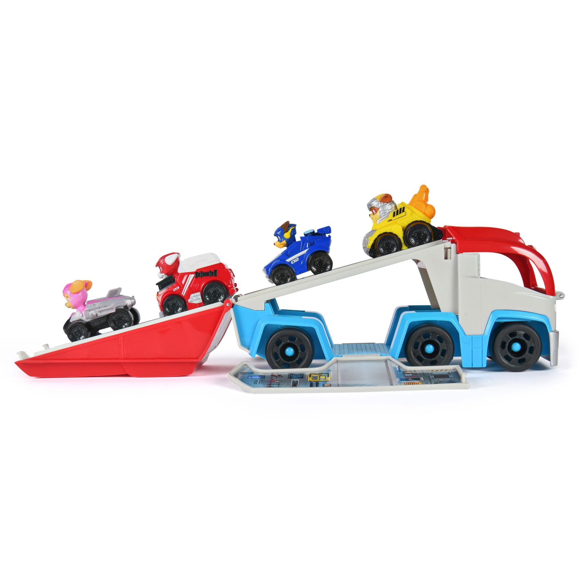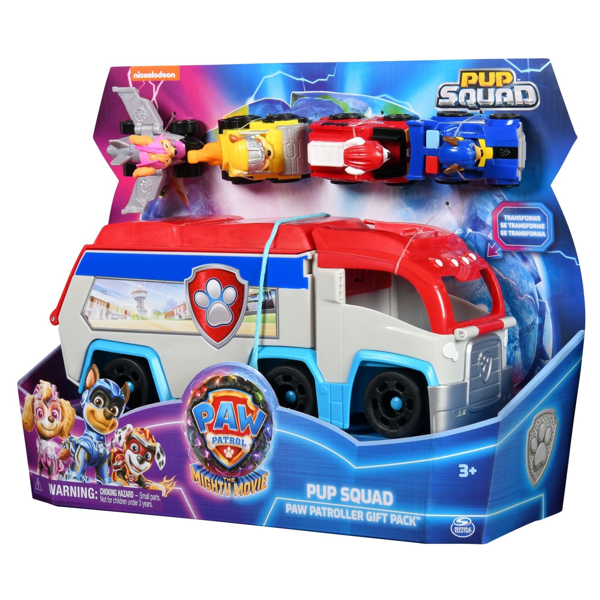 Exclusively at BJ'sPaw Patrol movie vehicle: The Pup Squad Patroller, with Chase, Marshall, Skye & Rubble Pup Squad Racers look just like the Mighty Pup vehicles in Paw Patrol: The Mighty Movie Transforming toy truck: Features an exciting transformation; Put a racer on the cab roof to engage the rear ramp, and walls for extra vehicle storage, before sending your race cars down the ramp Authentic mighty pups toy: There’s a world of Paw Patrol Mighty Pups toys to collect like the Pup Squad Racers, the super-cute Pup Squad Figures and the Pup Squad Paw Patroller (each sold separately) Collect them all: Expand your collection of Paw Patrol toys for girls and boys with toy trucks, action figures, diecast cars, dinosaur toys, stuffed animals, board games, jigsaw puzzles and more Includes pup squad patroller and four pup squad racers