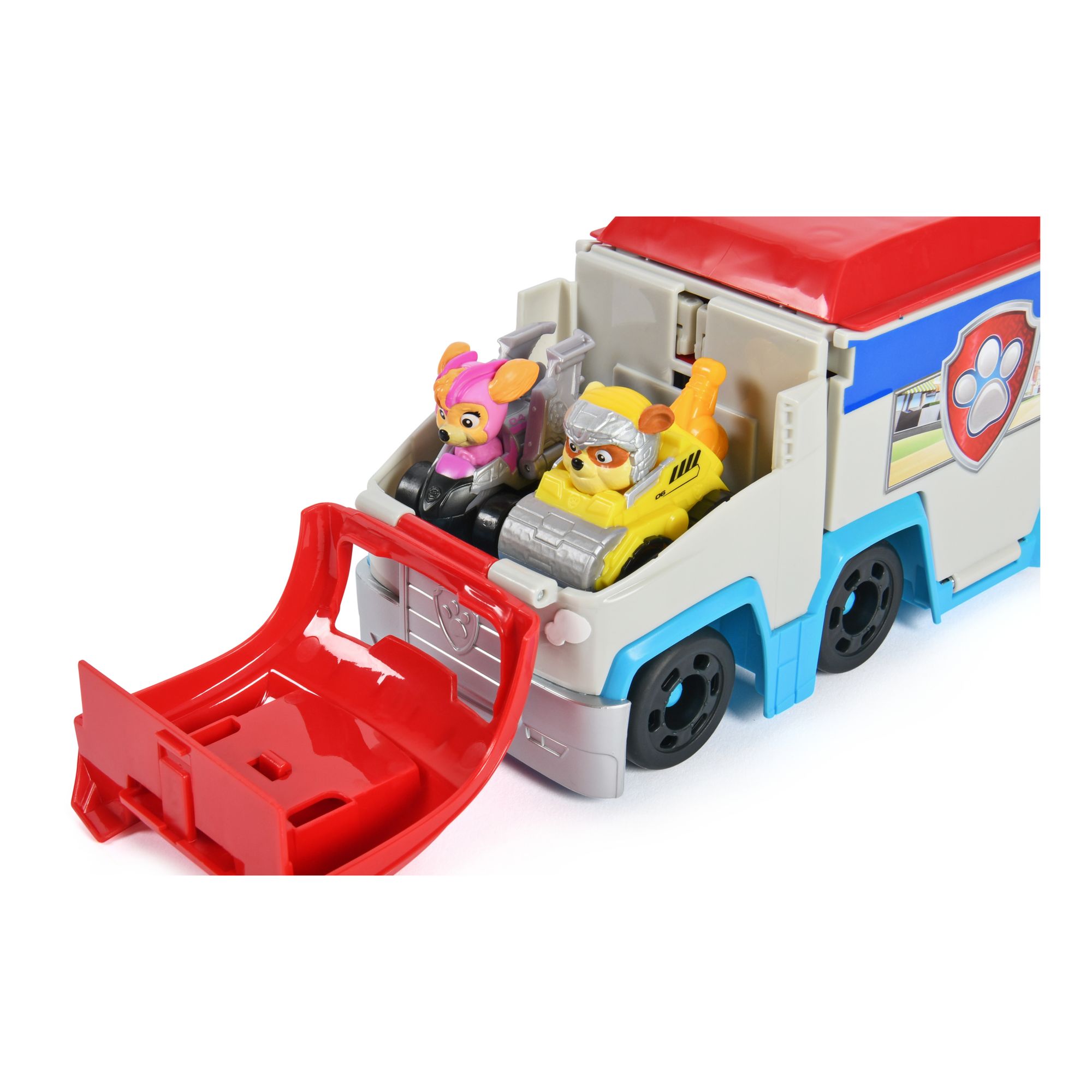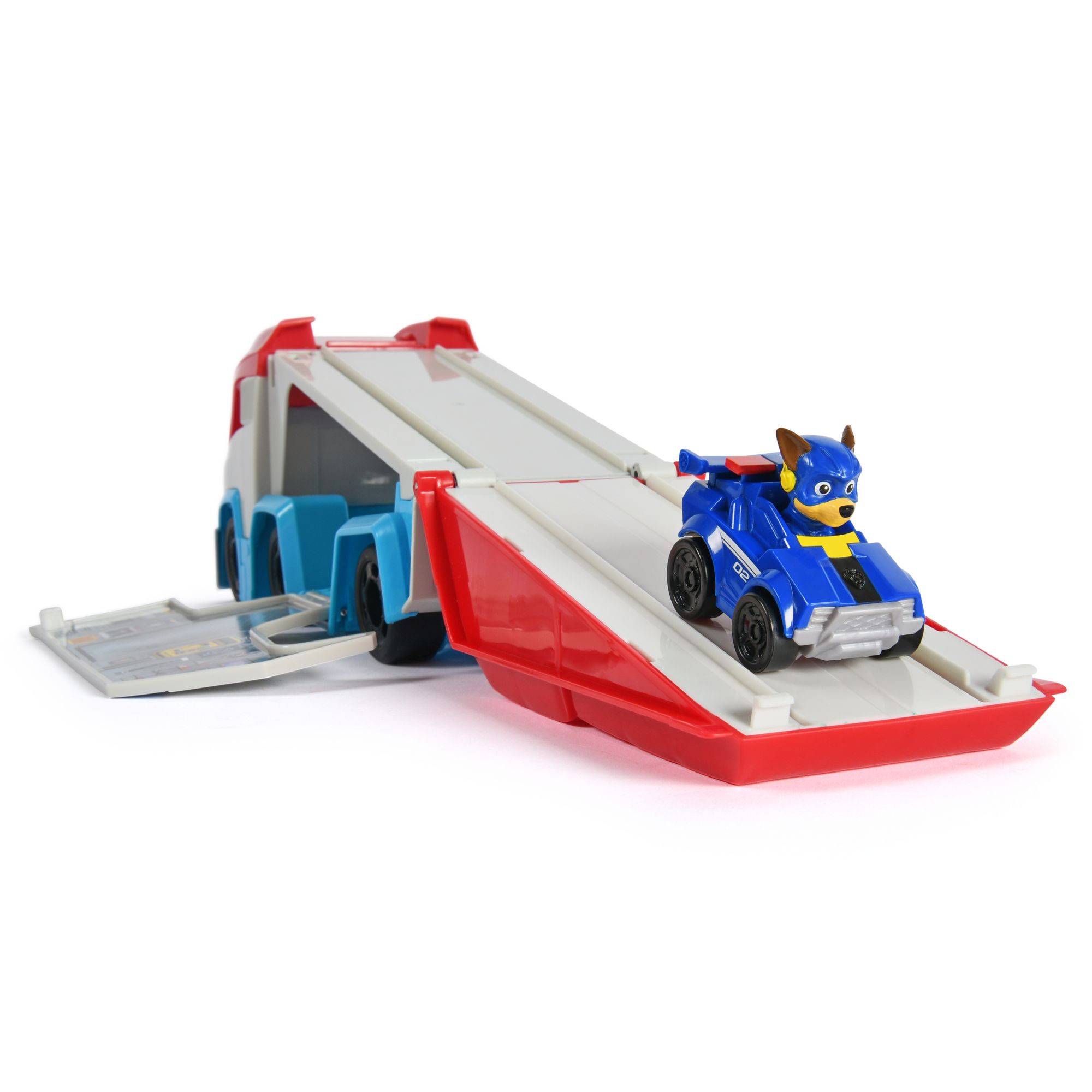 Get ready to launch toward your next rescue mission with a Pup Squad Patroller, along with collectible, Mighty Pups Chase, Marshall, Skye & Rubble Pup Squad Racers, just like you see in Paw Patrol: The Mighty Movie. Measuring 10"L and 5"H, the Pup Squad Patroller playset features an exciting transformation from a Paw Patroller toy truck, into an awesome mobile command center, complete with vehicle launch ramp and toy storage space, for additional Pup Squad race cars (each sold separately). Tilt the cab roof forward to place the Chase race car into the driver’s seat, before pushing the patroller forward on six real working wheels. Then, when it’s time for a high speed rescue, put one of the Pup Squad race cars on top of the cab to engage the transformation, which pops the trailers roof open to convert it into a launch ramp, and lowers the side walls to reveal a staging area and additional storage space for the rest of your vehicles. When playtime is over, fold the ramp and raise the walls to return into truck-mode, so you can pack up your toy car in the patroller, then take them with you anywhere, for exciting action on the go. With Paw Patrol toys, a kid can explore his or her imagination and develop their motor skills through pretend play while reliving their favorite scenes from the movie. For even more fun and exciting Paw Patrol series-inspired missions, expand your world of Paw Patrol by collecting all the Pup Squad Racers and all the Paw Patrol movie toys, like the awesome Aircraft Carrier HQ and the special edition Paw Patrol toys for girls and boys, like the Mighty Pups, Aqua Pups and Big Truck Pups toy figures and playsets (each sold separately). Enjoy endless Pawsome adventures with your favorite hero pups with the Paw Patrol: The Mighty Movie, Pup Squad Patroller and Pup Squad Racer Bundle