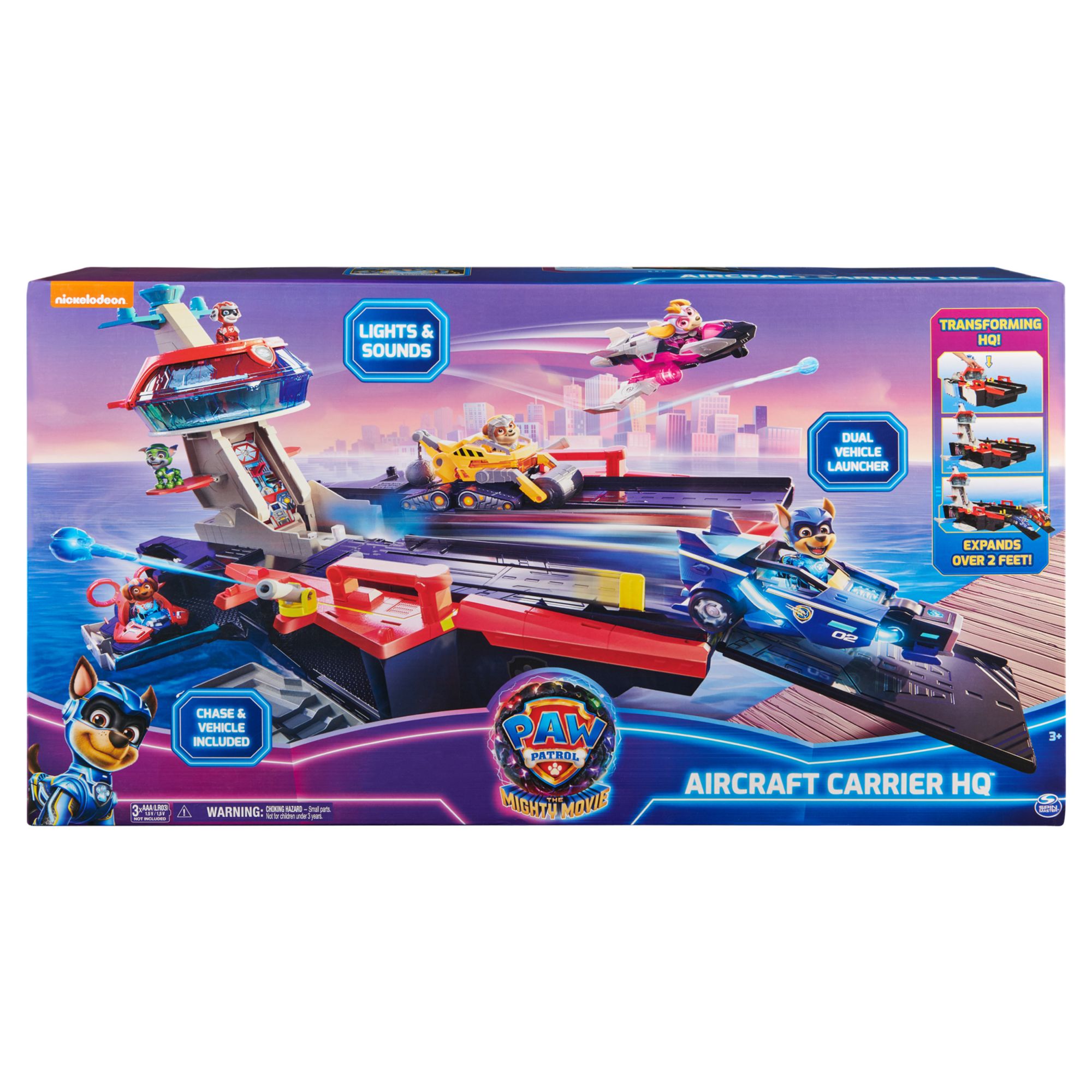 Introducing the Paw Patrol Aircraft Carrier HQ! This one of a kind transforming aircraft carrier toy is perfect for exciting rescue missions on the pretend seas and comes with a genuine Paw Patrol: The Mighty Movie Chase action figure and Chase's authentic police car rescue vehicle. Aircraft Carrier HQ transforms from 26" long and 14" wide, up to 37" long and 17" wide when it enters rescue mode. Pushing down on the HQ’s command center automatically triggers an awesome transformation by raising the control room upwards and splitting the deck into two separate vehicle launch ramps, to reveal a meteor core that lights up and activates sounds when you push it, and then opens four compartment doors for additional play areas and storage for toy cars, accessories and action figures. When it’s time for a supercharged rescue mission, load your rescue vehicle onto the launch ramp and press the launch button to watch your vehicle blast into action! Aircraft Carrier HQ also features two projectile launchers that you can load and fire to clear away obstacles during your rescues. With Paw Patrol toys, a kid can explore his or her imagination and develop their motor skills through pretend play while reliving their favorite scenes from the movie. For even more fun and exciting Paw Patrol series-inspired missions, collect all the Paw Patrol movie toys, like the awesome Aircraft Carrier HQ and all the special edition Paw patrol toys for girls and boys, like the Mighty Pups, Aqua Pups and Big Truck Pups toy figures and playsets (each sold separately) to enjoy endless PAWsome adventures with your favorite hero pup, in the Aircraft Carrier HQ.