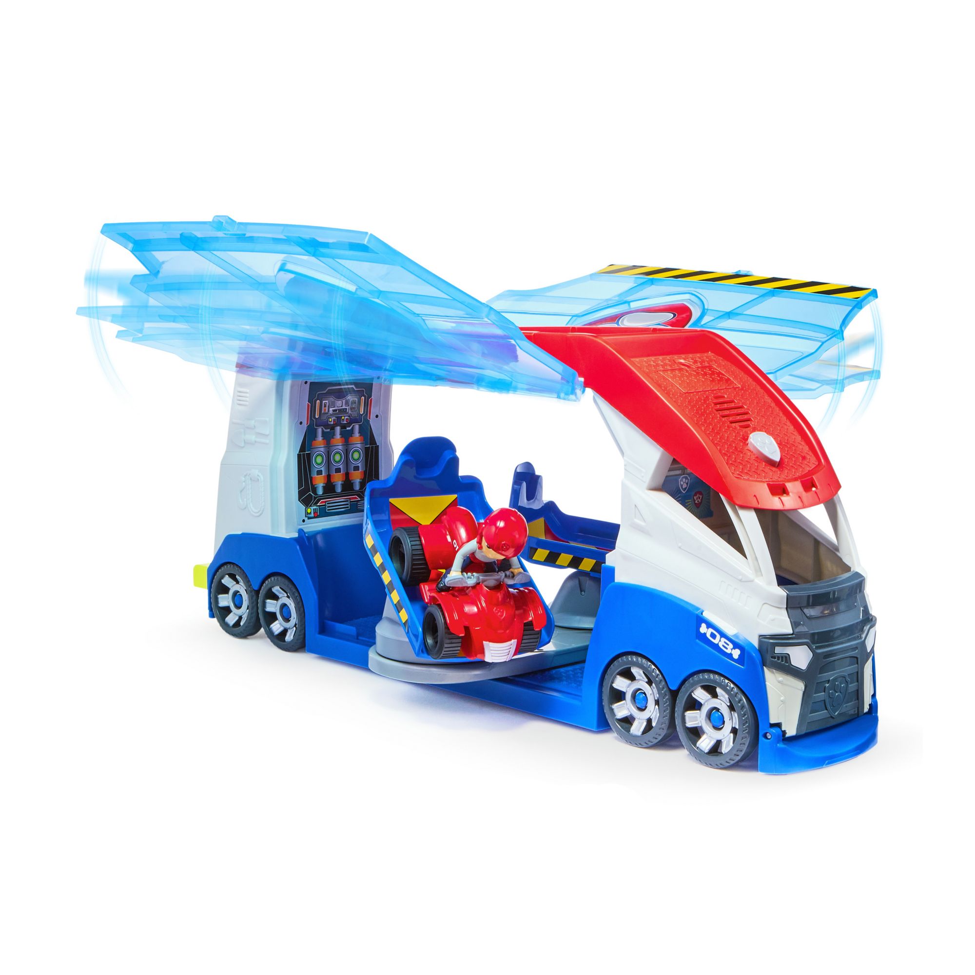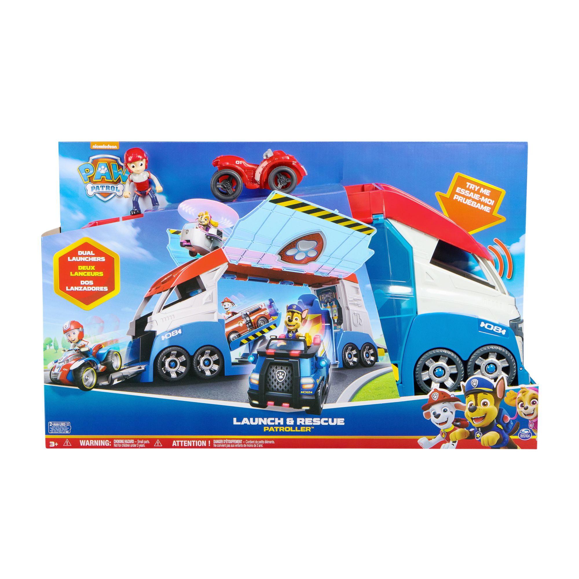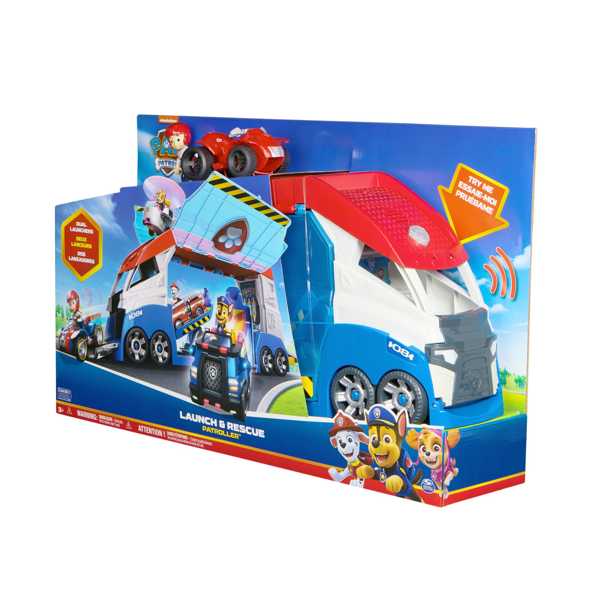 Dual vehicle launchers: Load Ryder and his ATV vehicle into one of the launchers and pull the lever, to raise the doors and launch your PAW Patrol toys, then push a button for thrilling sound effects