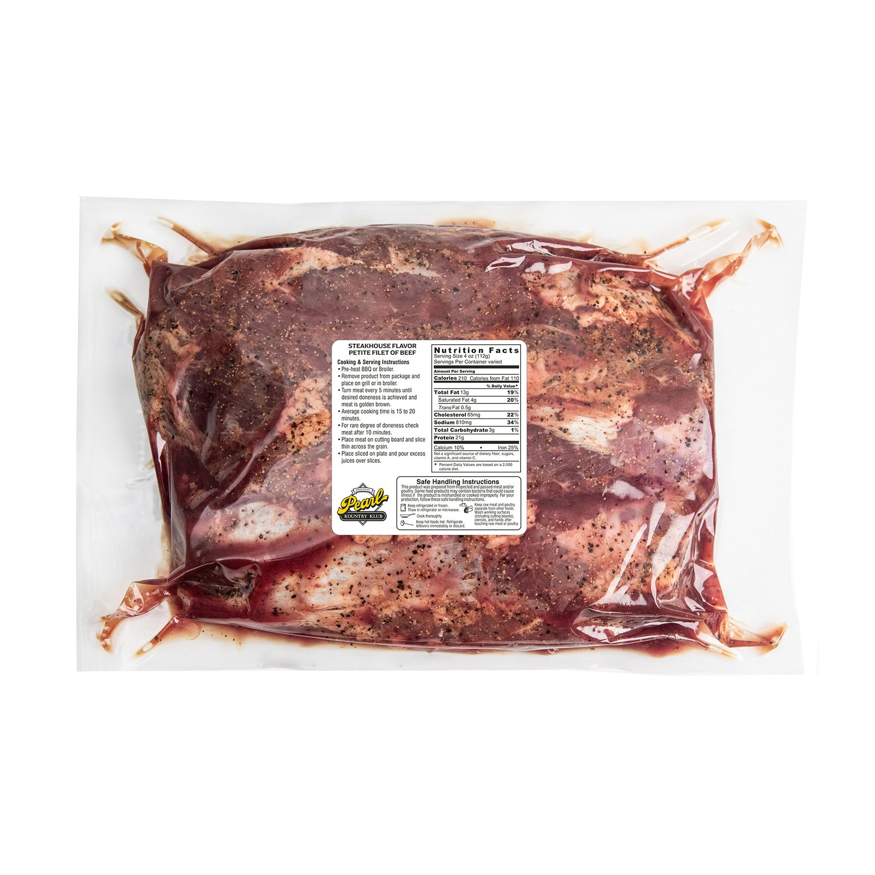 Pearl Meat has built on its reputation for offering the best quality meats and expanded into the marinated meats sector. Their unwavering commitment to quality and great taste has made their marinated meats a success. They use only the freshest choice cuts, slowly marinade them with unique flavors, and provide their customers with a convenient meal solution. This Steakhouse marinated petite filet of beef is no exception. A quick protein for at home cooking with a restaurant flavor for center of the plate dinner with extra for leftovers. Ready to grill, broil or pan sear! On the BBQ or broiler: 1. Pre-heat BBQ or broiler. 2. Remove product from package and place on grill or in broiler. 3. Turn meat every 5 minutes until desired doneness is achieved and meat is golden brown. 4. Average cooking time is 15 to 20 minutes. 5. For rare degree of doneness check meat after 10 minutes. Serving preparation: 1. Place meat on cutting board and slice thin across the grain with sharp knife. 2. Place slices on plate and pour excess juices over slices.