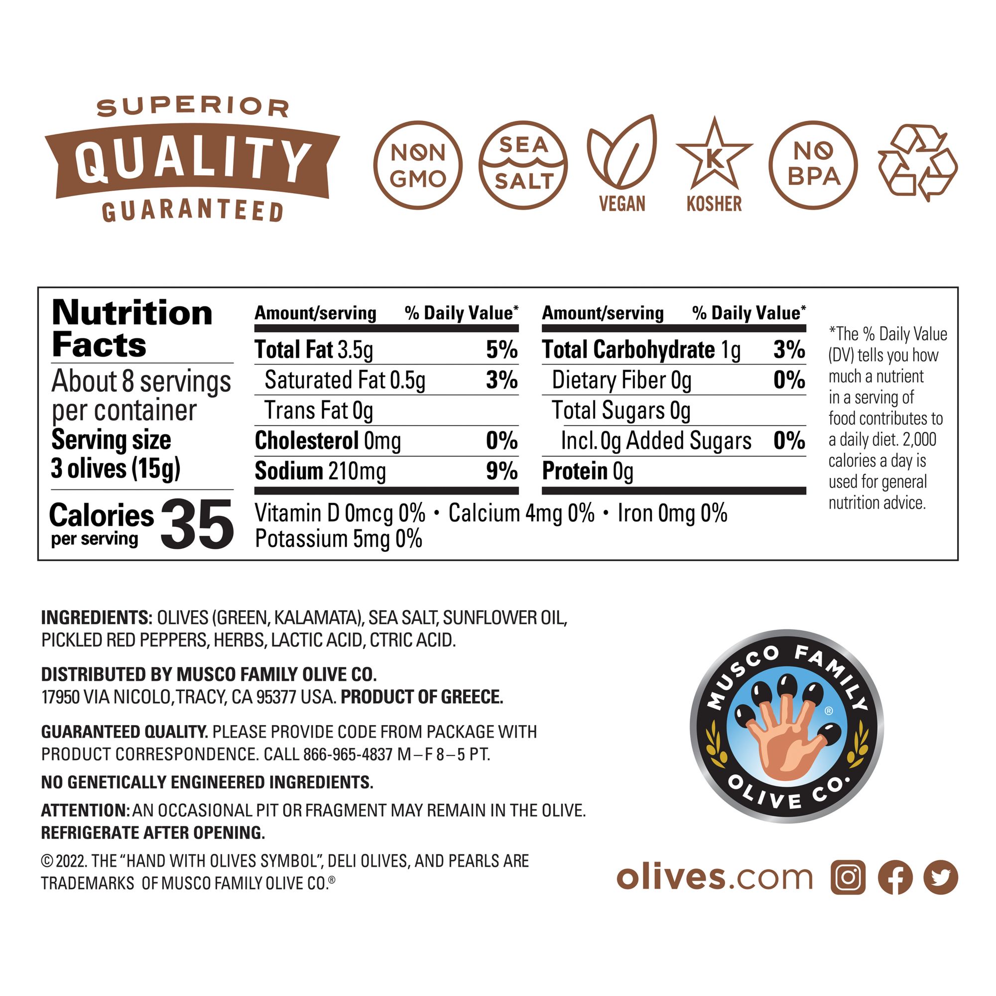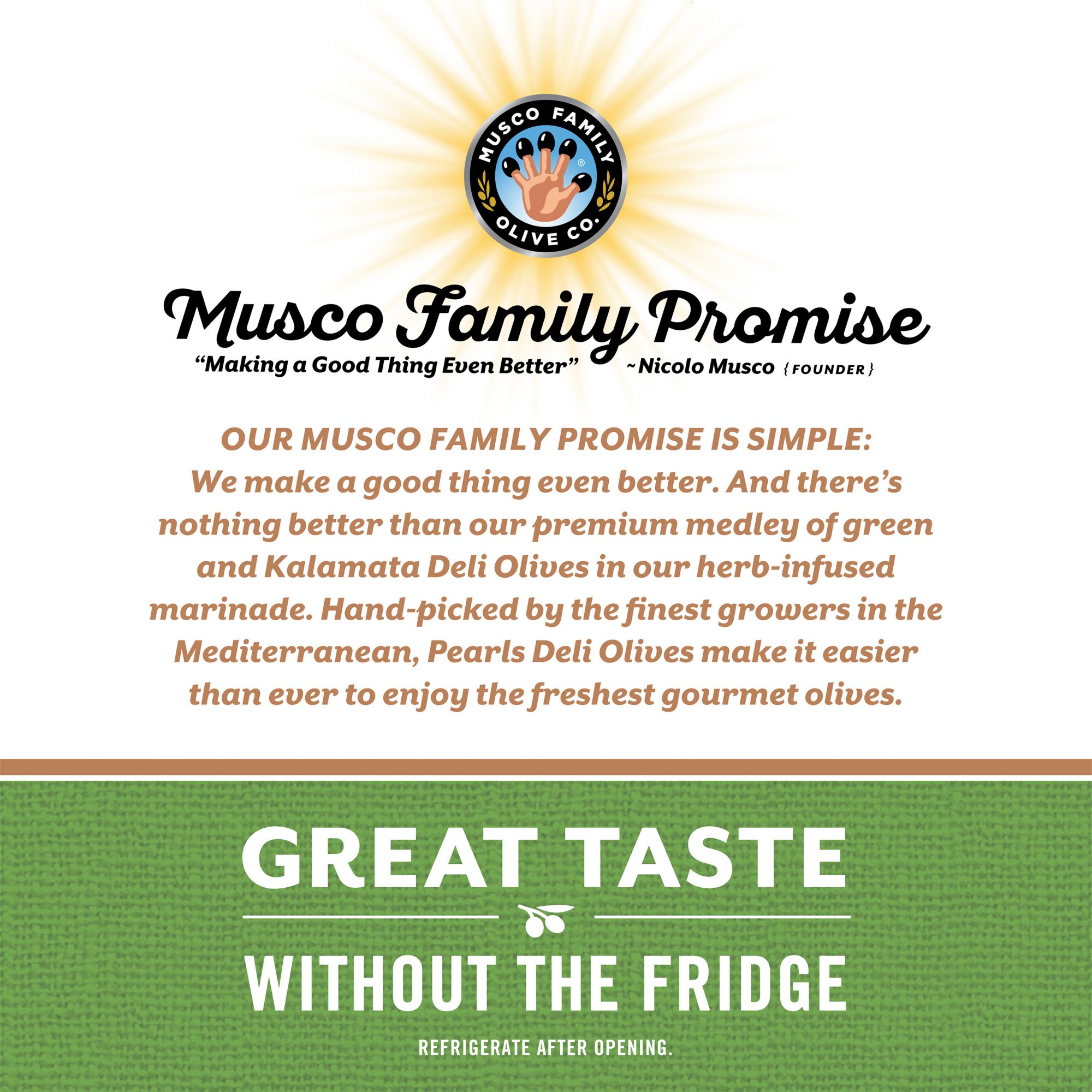 The Musco Family promise is simple: To make a good thing even better. And there's nothing even better than a premium medley of green and Kalamata Deli Olives in an herb-infused marinade. Hand-picked by the finest growers in the Mediterranean, Pearls Deli Olives make it easier than ever to enjoy the freshest gourmet olives.