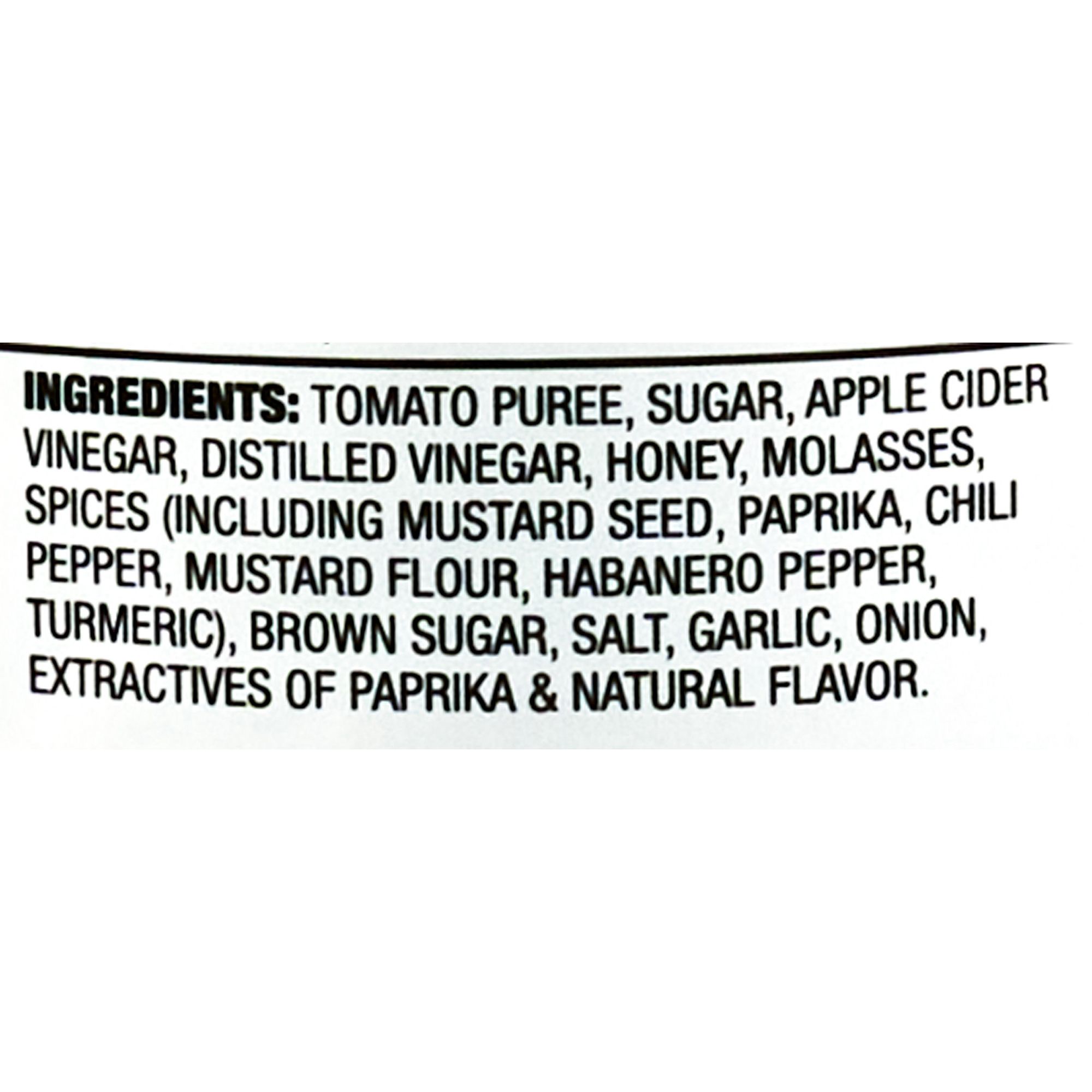 Ingredients: Tomato Puree, Sugar, Apple Cider Vinegar, Distilled Vinegar, Honey, Molasses, Spices Including Mustard Seed, Paprika, Chili Pepper, Mustard Flour, Habanero Pepper, Turmeric), Brown Sugar, Salt, Garlic, Onion, Extractives Of Paprika & Natural Flavor.