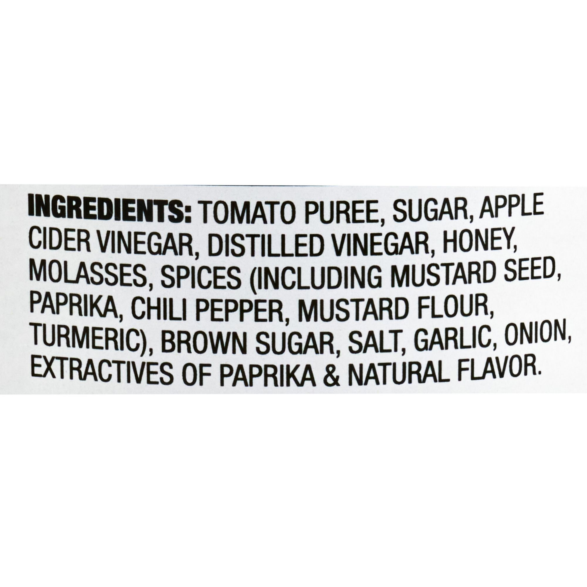Ingredients: Tomato Puree, Sugar, Apple Cider Vinegar, Distilled Vinegar, Honey, Molasses, Spices (Including Mustard Seed, Paprika, Chili Pepper, Mustard Flour, Turmeric), Brown Sugar, Salt, Garlic, Onion, Extractives Of Paprika & Natural Flavor.