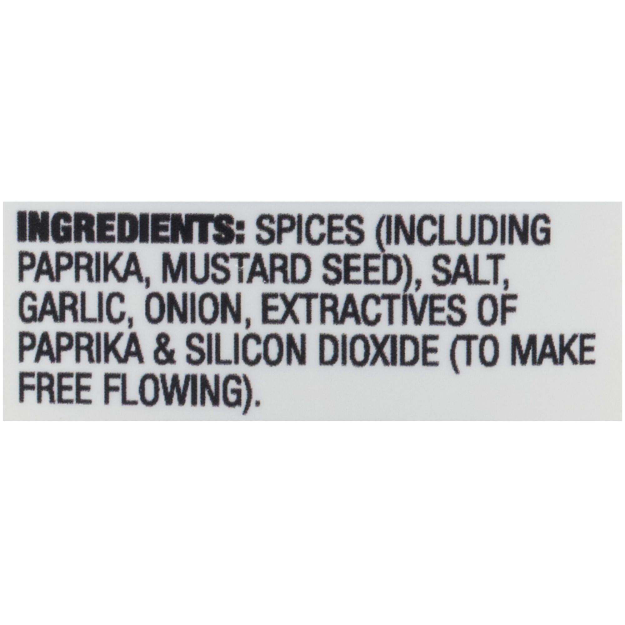 Ingredients: Spices (Including Paprika, Mustard Seed), Salt, Garlic, Onion, Extractives Of Paprika & Silicon Dioxide (To Make Free Flowing).