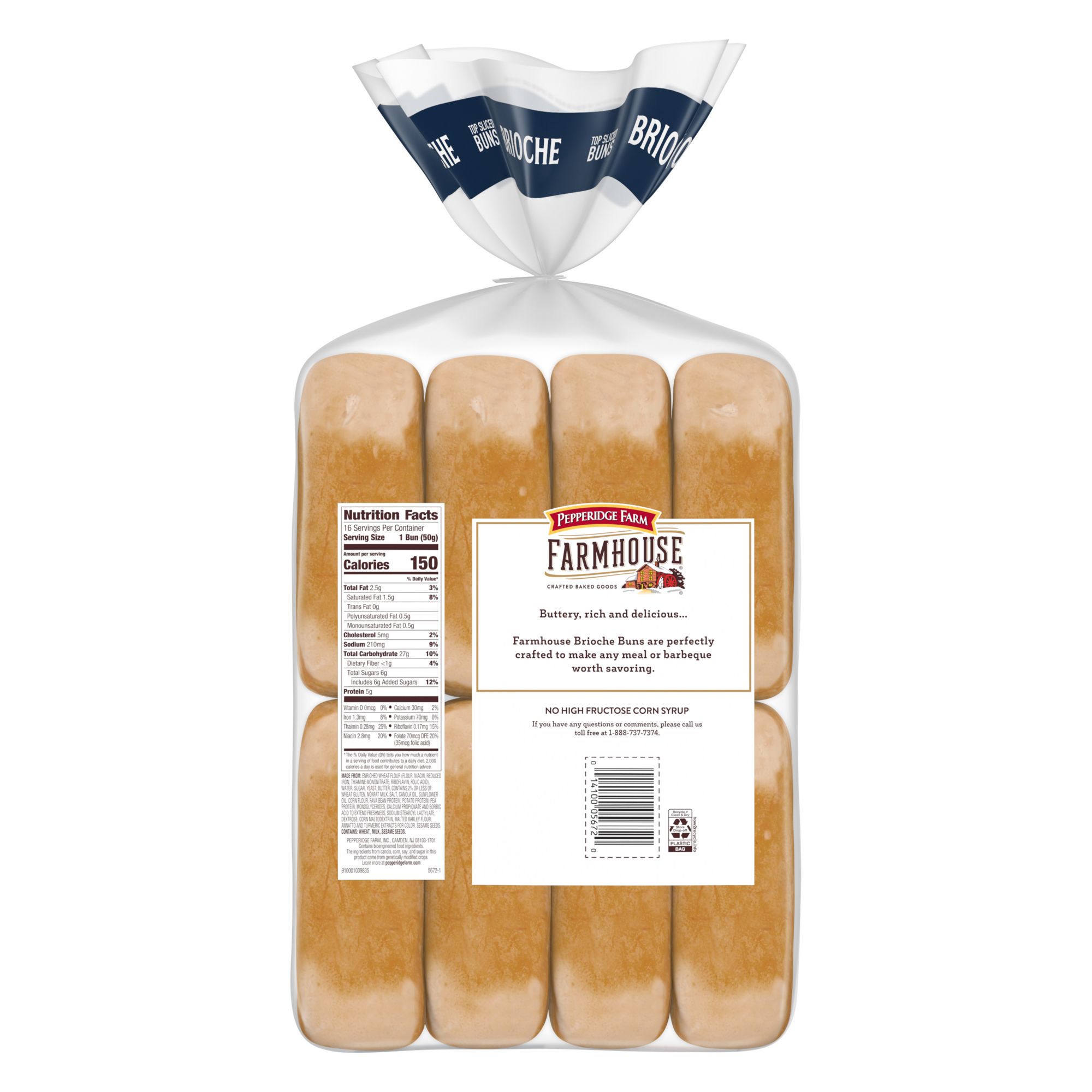 Pepperidge Farm Brioche Hot Dog Buns are baked with thoughtful care. Each Farmhouse Brioche bun is the perfect balance of sweet and buttery goodness. Whether enhancing your hot dogs or enjoying a lobster roll, these buns are sure to make any meal worth savoring. Add the comfort of homemade taste in every bite with our Pepperidge Farm Farmhouse Brioche Hot Dog Buns. The flavor and texture of delicious, buttery buns just can't be rushed, and that's why our bakers bake our Farmhouse buns with deliberate, thoughtful care. Brioche Hot Dog Buns are crafted with the perfect balance of sweet, salty and buttery goodness. For Pepperidge Farm, baking is more than a job. It's a real passion. Each day, our bakers take the time to make every bun the best way they know how – by using carefully selected, quality ingredients. Whether enhancing your hot dogs or enjoying a lobster roll, these buns are sure to make any meal worth savoring. Make your meals a little more special with our 8-pack of delicious brioche buns. No high fructose corn syrup.