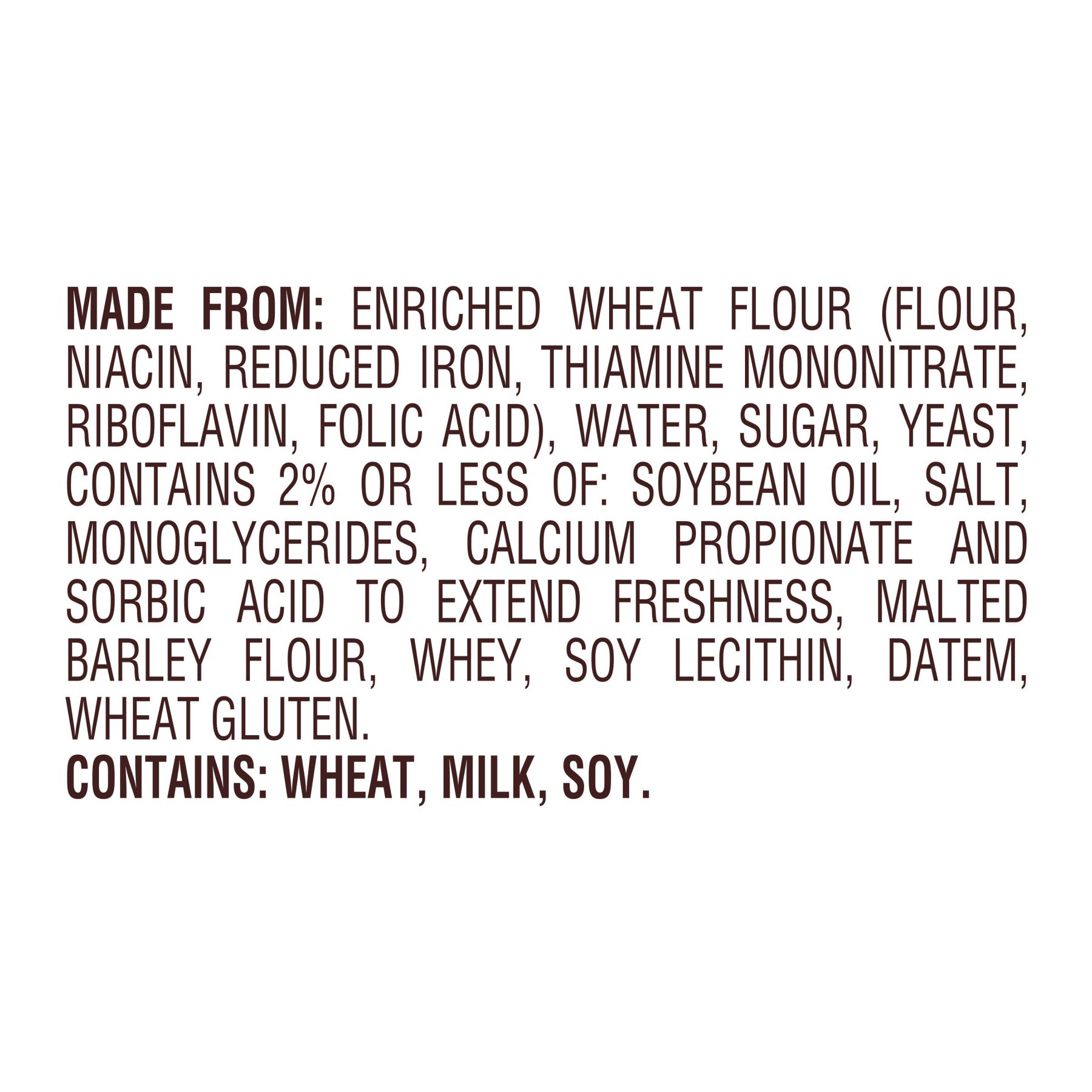 Ingredients: Made From: Enriched Wheat Flour (Flour, Niacin, Reduced Iron, Thiamine Mononitrate, Riboflavin, Folic Acid), Water, Sugar, Yeast, Contains 2% Or Less Of: Salt, Vegetable Oils (Soybean And/or Canola), Monoglycerides, Calcium Propionate And Sorbic Acid To Extend Freshness, Malted Barley Flour, Whey, Soy Lecithin, Datem, Wheat Gluten. Contains: Wheat, Milk, Soy.