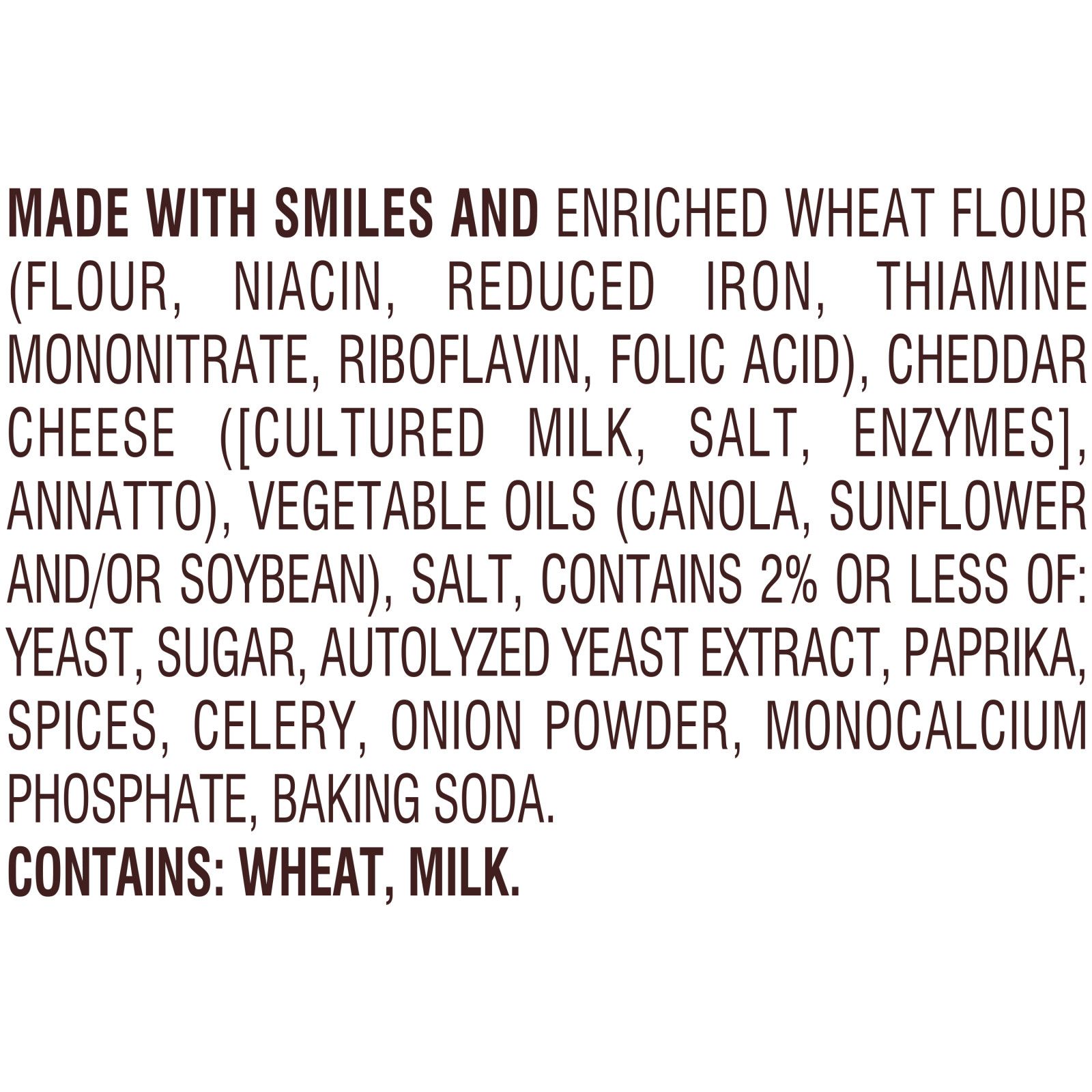 Ingredients: Made With Smiles And Enriched Wheat Flour (Flour, Niacin, Reduced Iron, Thiamine Mononitrate, Riboflavin, Folic Acid), Cheddar Cheese ([Cultured Milk, Salt, Enzymes], Annatto), Vegetable Oils (Canola, Sunflower And/or Soybean), Salt, Contains 2% Or Less Of: Yeast, Sugar, Autolyzed Yeast Extract, Paprika, Spices, Celery, Onion Powder, Monocalcium Phosphate, Baking Soda. Contains: Wheat, Milk.