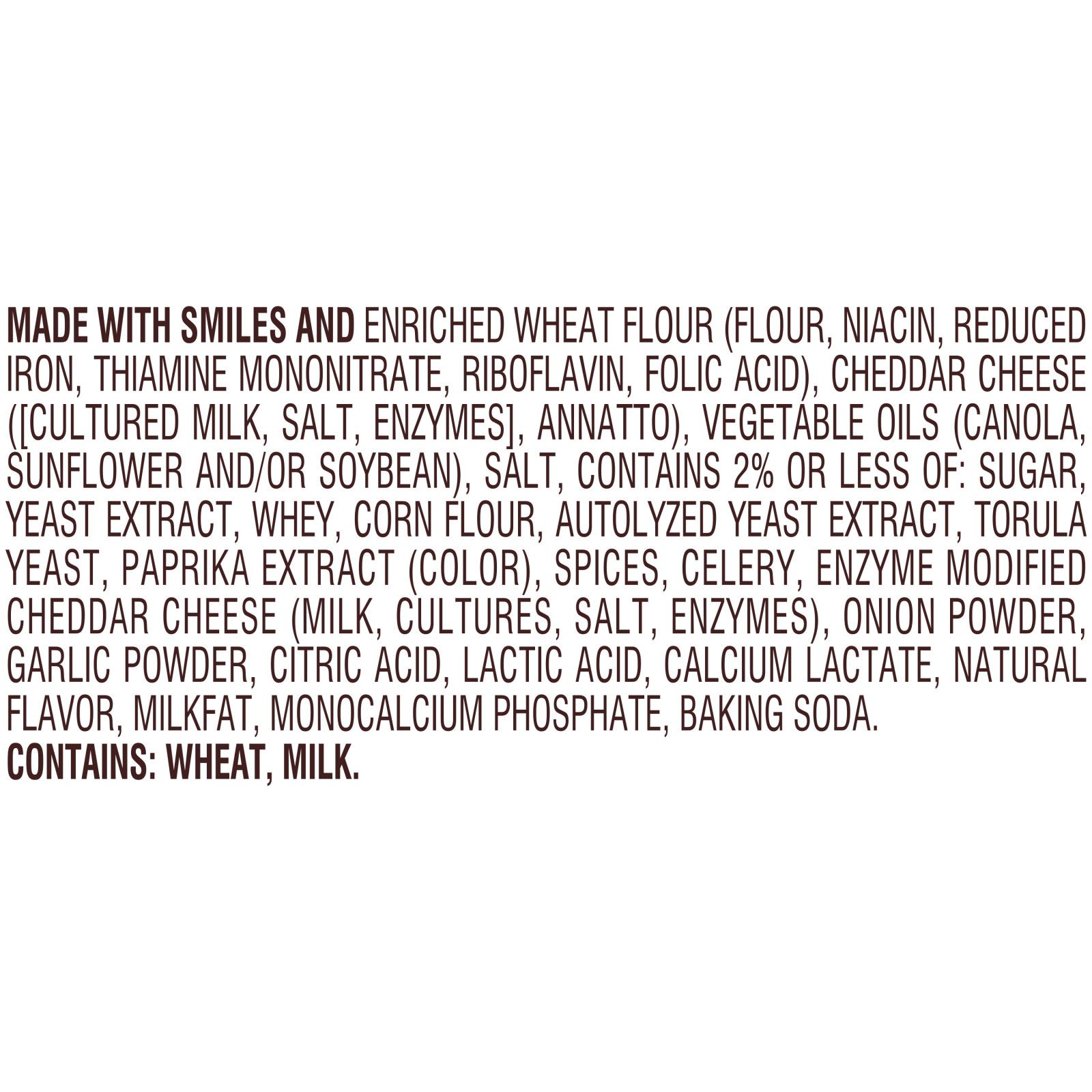 Ingredients: Made With Smiles And Enriched Wheat Flour (Flour, Niacin, Reduced Iron, Thiamine Mononitrate, Riboflavin, Folic Acid), Cheddar Cheese ([Cultured Milk, Salt, Enzymes], Annatto), Vegetable Oils (Canola, Sunflower And/or Soybean), Salt, Contains 2% Or Less Of: Sugar, Yeast Extract, Whey, Corn Flour, Autolyzed Yeast Extract, Torula Yeast, Paprika Extract (Color), Spices, Celery, Enzyme Modified Cheddar Cheese (Milk, Cultures, Salt, Enzymes), Onion Powder, Garlic Powder, Citric Acid, Lactic Acid, Calcium Lactate, Natural Flavor, Milkfat, Monocalcium Phosphate, Baking Soda. Contains: Wheat, Milk.