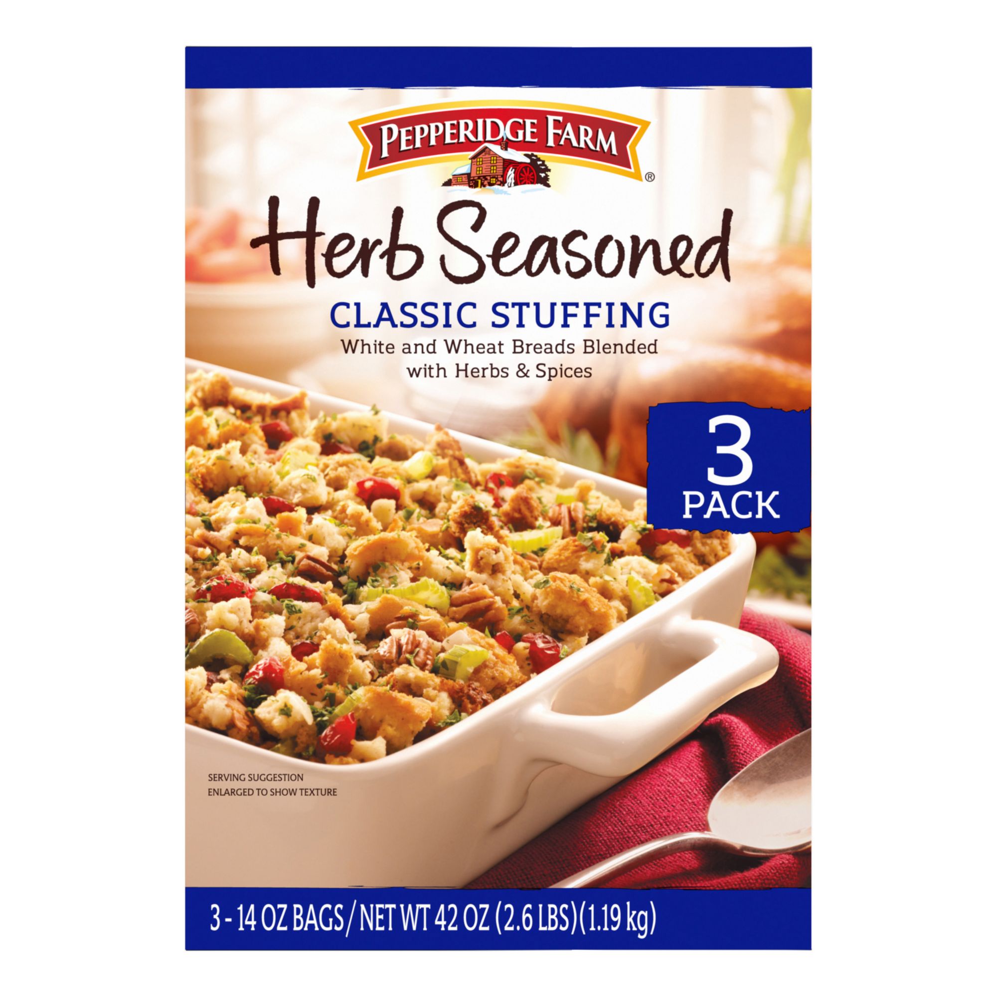 For holiday meals or everyday dinners, enjoy Pepperidge Farm Herb Seasoned Stuffing - made from their premium white and wheat breads and perfectly seasoned to create a gratifyingly delicious side dish! Follow the instructions on pack for delicious Herb Stuffing perfect for effortless entertaining, or customize with your own personal touch. Pepperidge Farm Stuffing is perfect for the holidays or for making any dinner feel more special. For Pepperidge Farm, baking is more than a job. It's a real passion. Each day, their bakers take the time to make every cookie, pastry, cracker, and loaf of bread the best way they know how - by using carefully selected, quality ingredients.