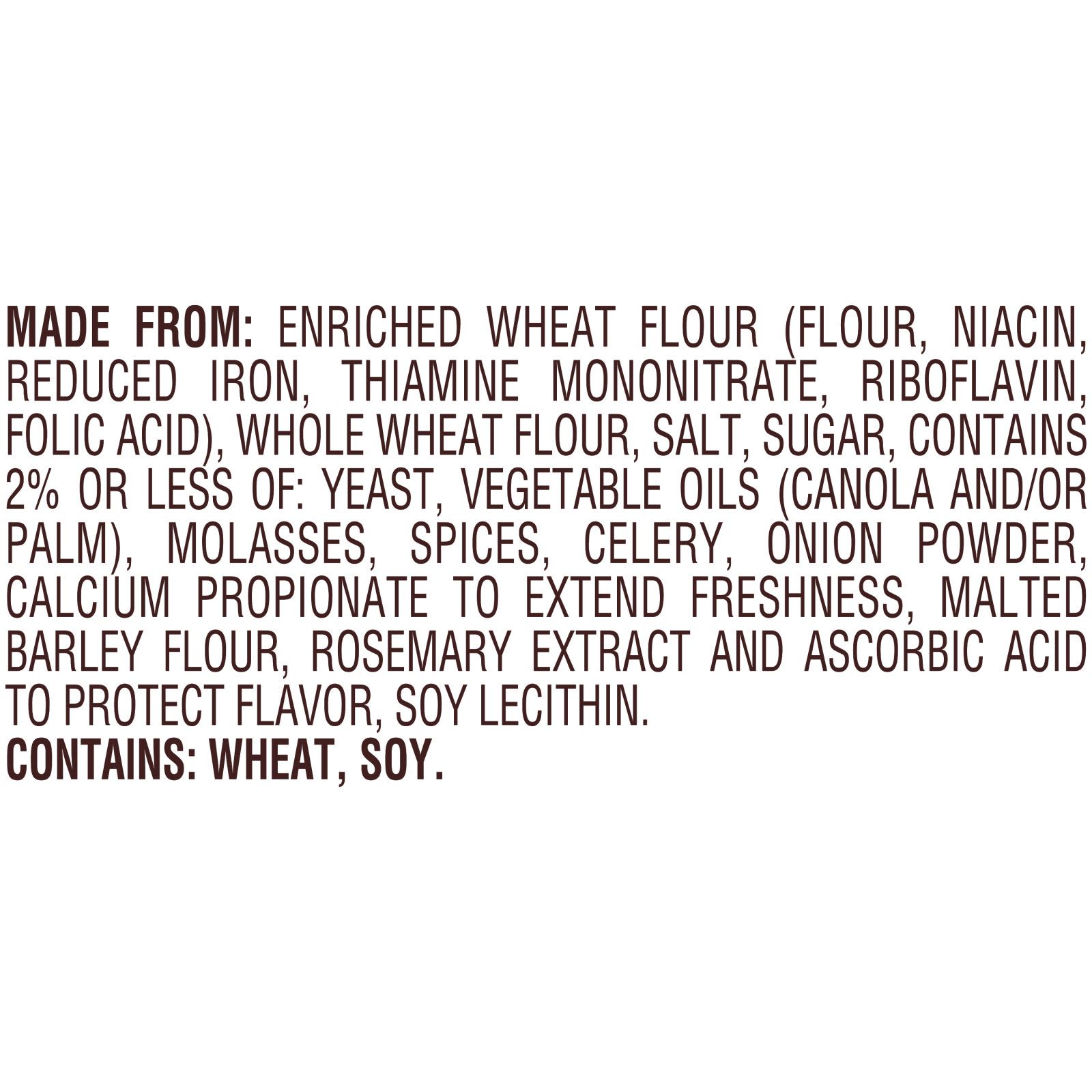 Ingredients: Made From: Enriched Wheat Flour (Flour, Niacin, Reduced Iron, Thiamine Mononitrate, Riboflavin, Folic Acid), Whole Wheat Flour, Salt, Sugar, Yeast, Contains 2% Or Less Of: Vegetable Oils (Canola And/or Sunflower And/or Palm), Molasses, Spices, Celery, Onion Powder, Calcium Propionate To Extend Freshness, Malted Barley Flour, Rosemary Extract And Ascorbic Acid To Protect Flavor, Soy Lecithin. Contains: Wheat, Soy.