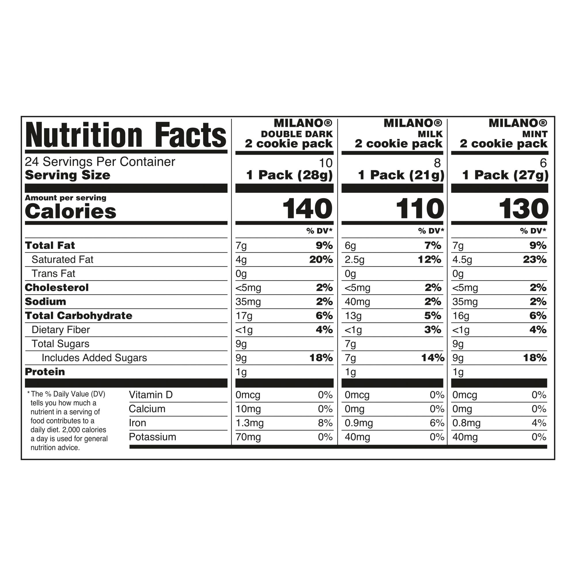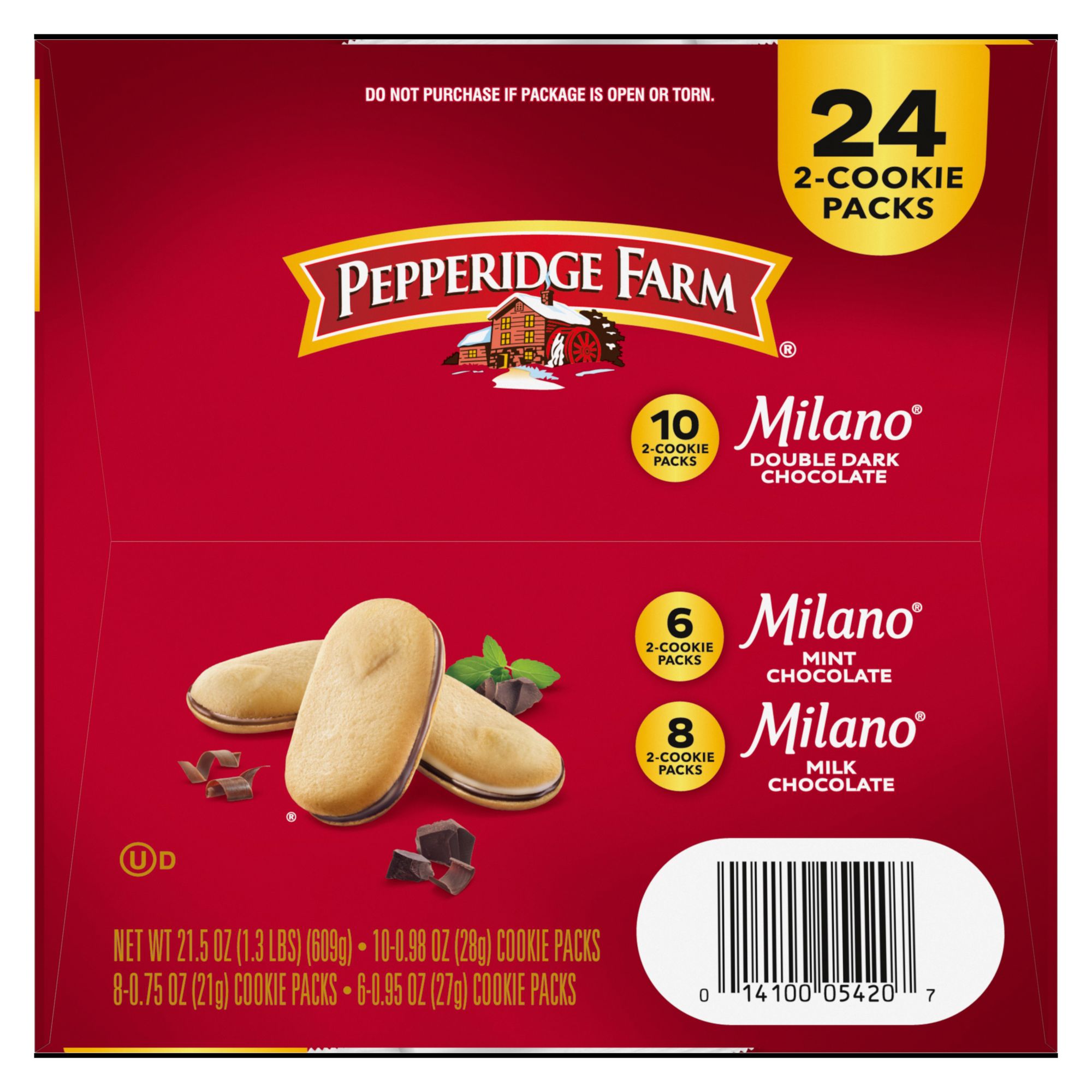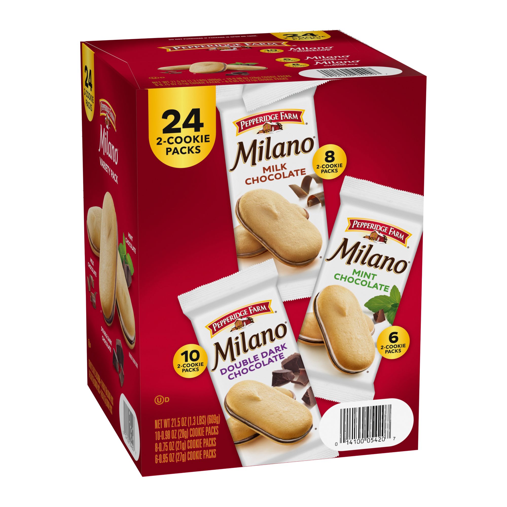 Enjoy this variety pack of your favorite Pepperidge Farm cookies! Contains 8 packs of Milano Double Dark Chocolate, 8 packs of Milano Milk Chocolate Cookies and 8 packs of Milano Mint Chocolate Cookies (2 cookies per pack). Perfect for when you need a sweet treat on the go, or a personal dessert just for yourself. When you just need a little me-time, Pepperidge Farm Milano Cookies are there for you with three flavors to choose from. Delicate, sweet and oh, so indulgent, Milano cookies are that special treat your day needs - your me-time must-have. Get ready to enjoy two delicious cookies in every snack pack. So go ahead and indulge. You deserve it!