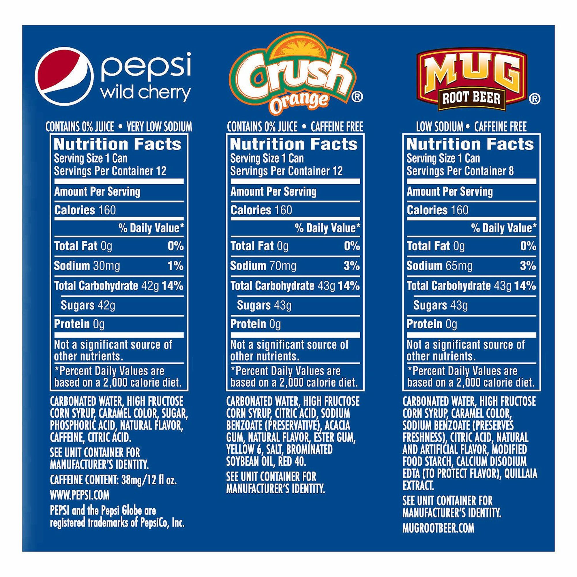 12 Wild Cherry Pepsi soda cans 12 Orange Crush soda cans 8 Mug Root Beer soda cans Includes thirty-two 12 fl. oz. cans of soda