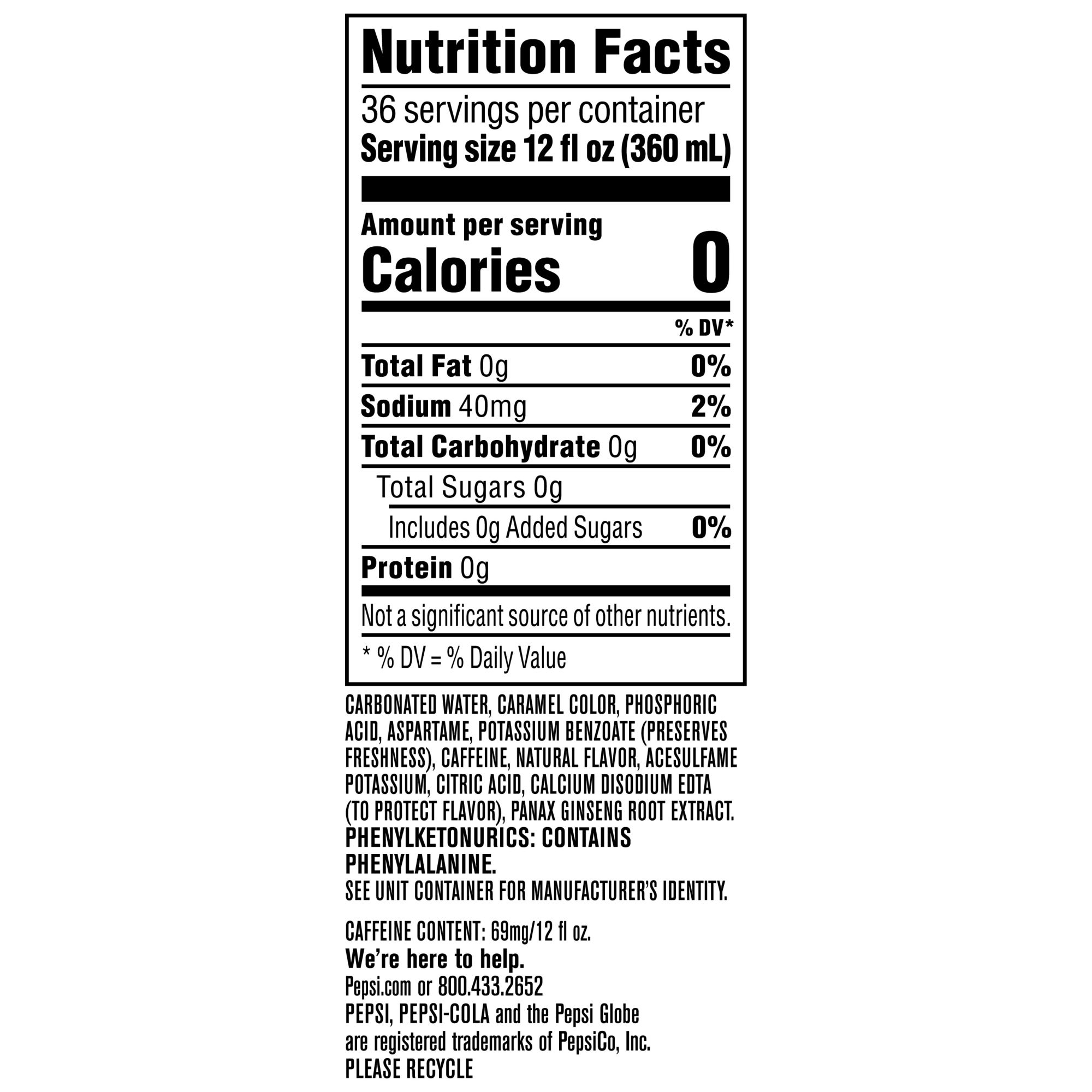 Ingredients: Carbonated Water, Caramel Color, Phosphoric Acid, Aspartame, Potassium Benzoate (Preserves Freshness), Caffeine, Natural Flavor, Acesulfame Potassium, Citric Acid, Calcium Disodium EDTA (To Protect Flavor), Panax Ginseng Root Extract.