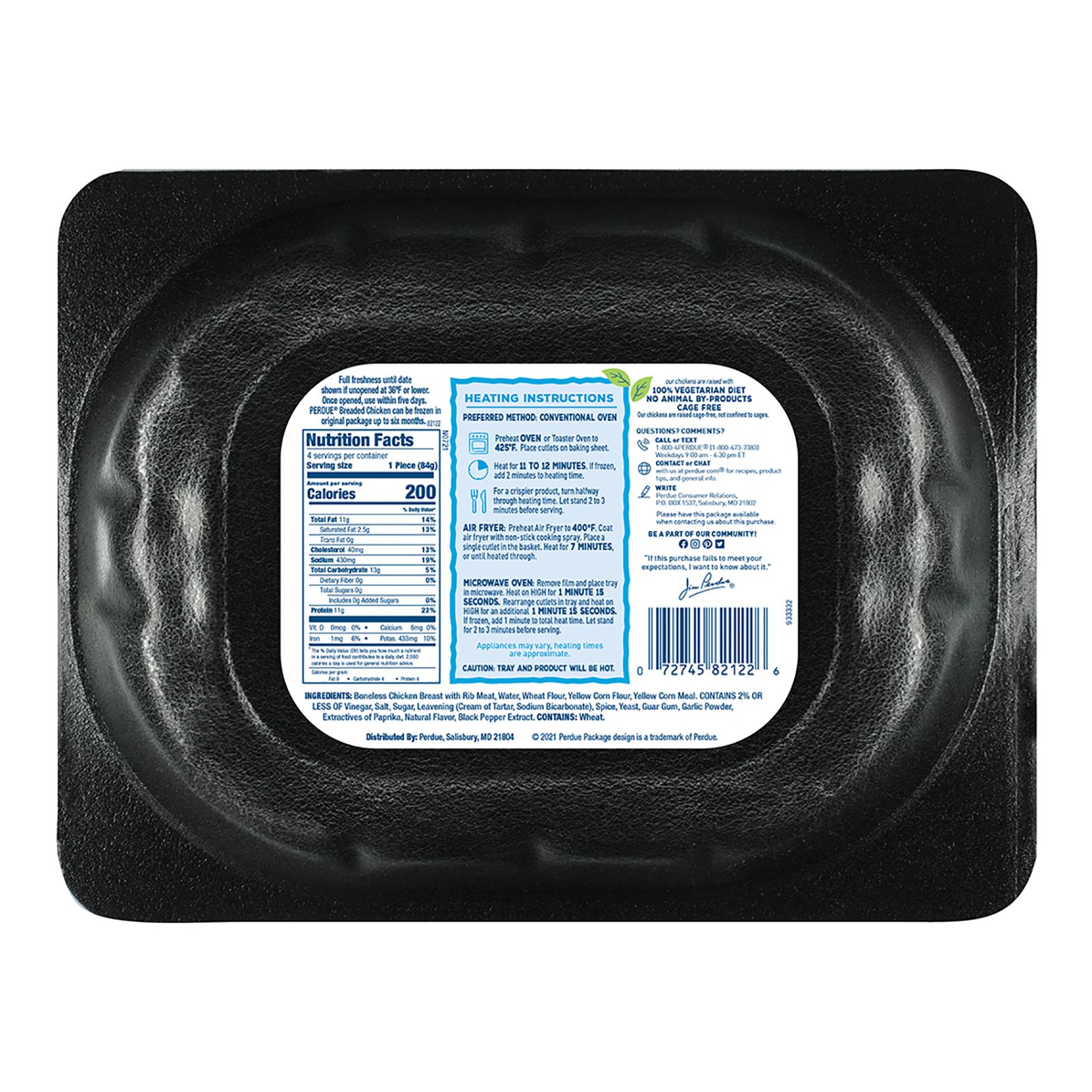 Fully cooked breaded chicken breast cutlets All-natural ingredients No preservatives or fillers 100% white meat chicken No hormones or steroids added USDA process verified Cage-free chickens fed vegetarian diet with no animal by-products Heat and eat convenience Includes three 12-oz. packages