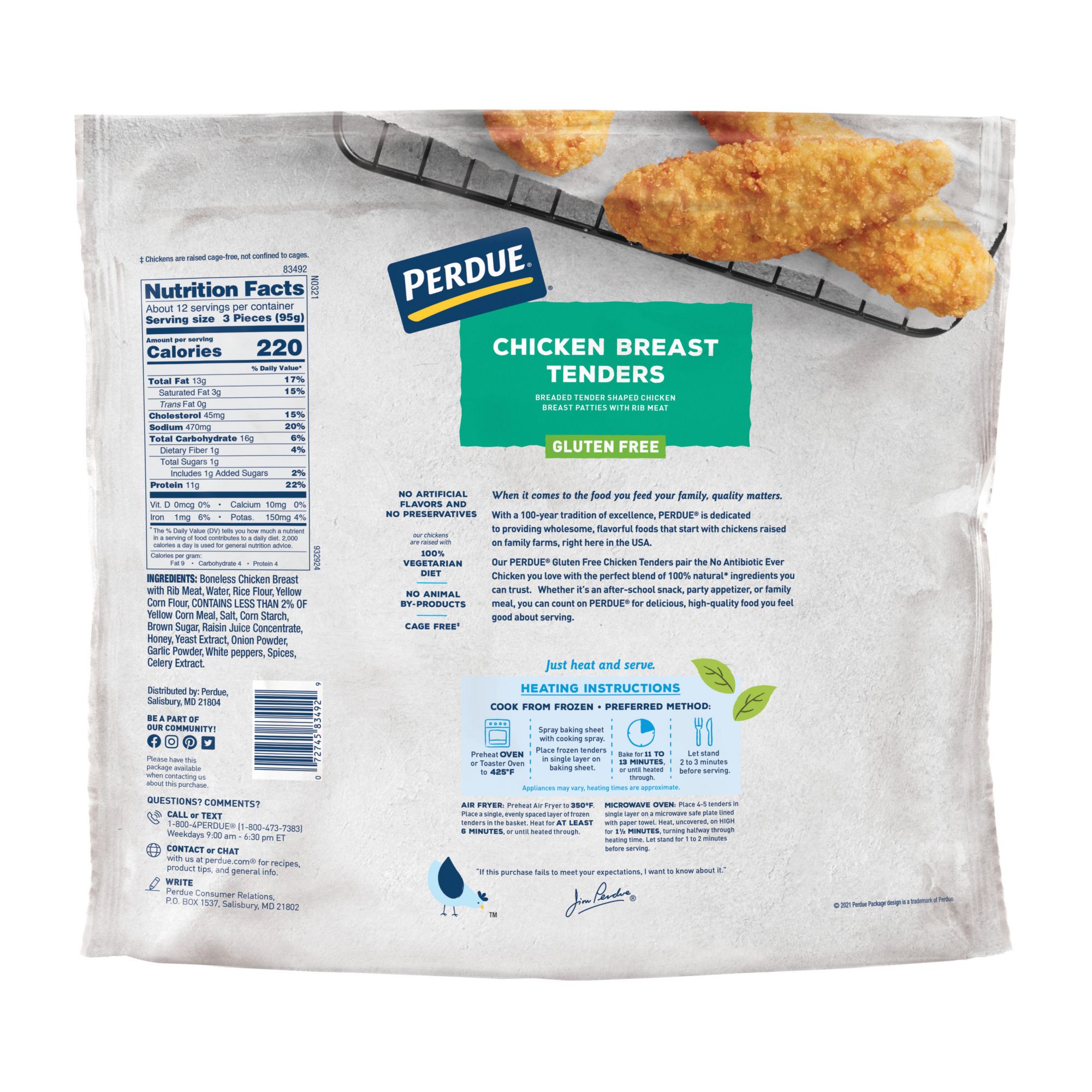 Perdue Gluten Free Chicken Breast Tenders are made with boneless chicken breast meat and coated with a tasty breading! Crisp and juicy right out of the oven, these no antibiotics ever chicken tenders are great for the whole family. Serve with fresh fruit and celery sticks for a gluten-free meal everyone will love! At Perdue, they're hungry for better chicken and that means paying attention to all of the details, no matter how big or small. They believe their practices – like providing healthy feed and a happy environment for their chickens – lead to better tasting chicken. And they think you’ll agree: take one bite and taste the difference that comes from their relentless pursuit of better-tasting chicken.