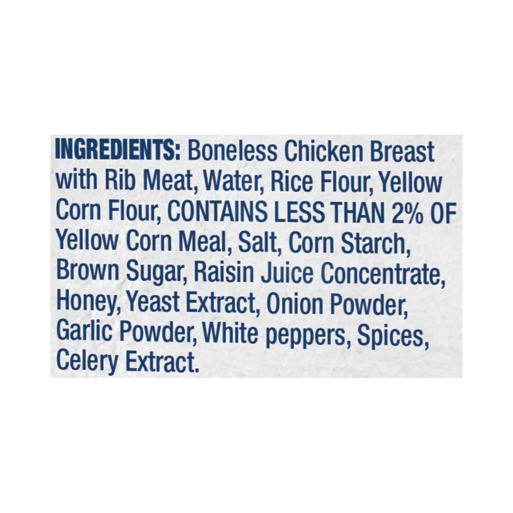 Ingredients: Boneless Chicken Breast With Rib Meat, Water, Rice Flour, Yellow Corn Flour, Contains Less Than 2% Of Yellow Corn Meal, Salt, Corn Starch, Brown Sugar, Raisin Juice Concentrate, Honey, Yeast Extract, Onion Powder, Garlic Powder, White Peppers, Spices, Celery Extract.