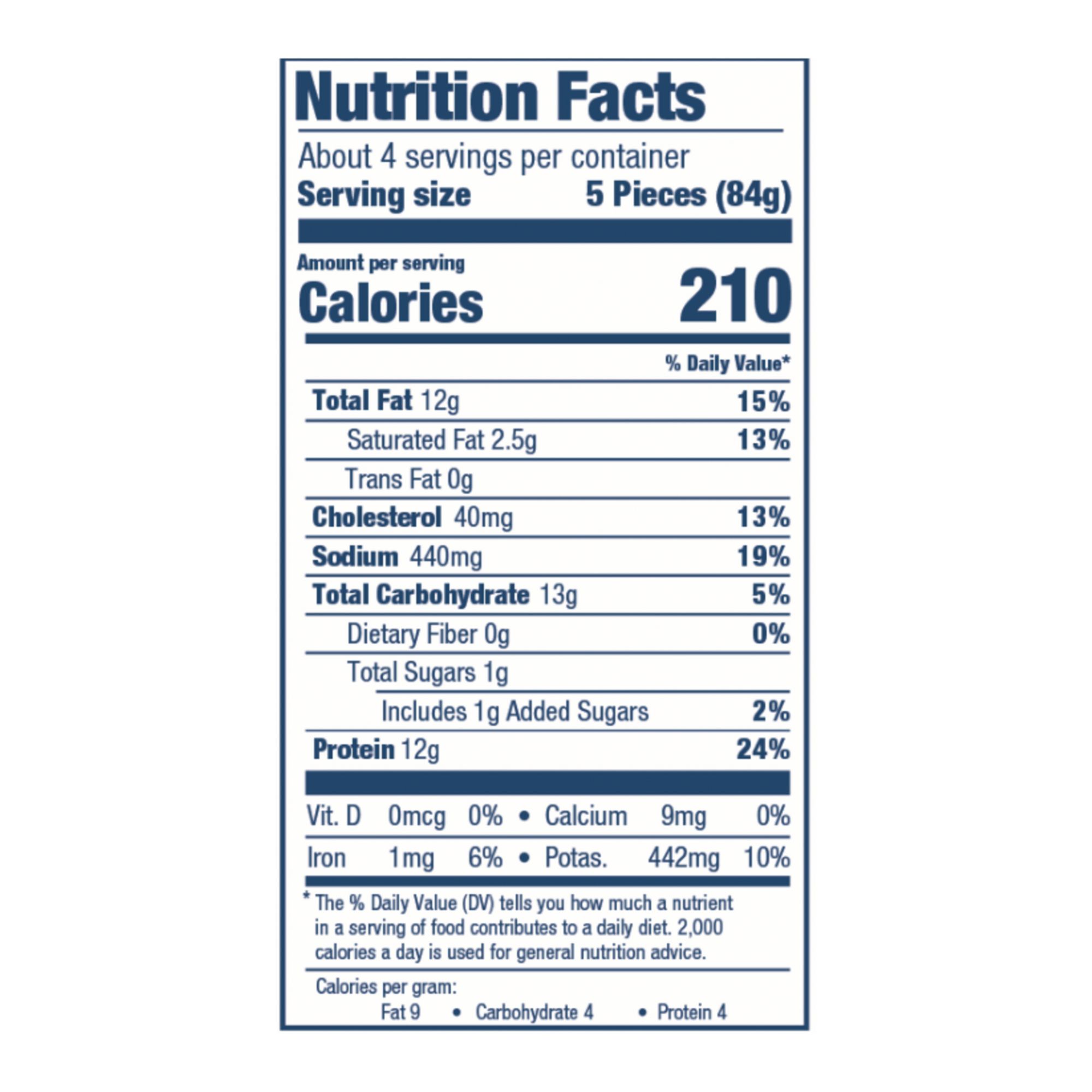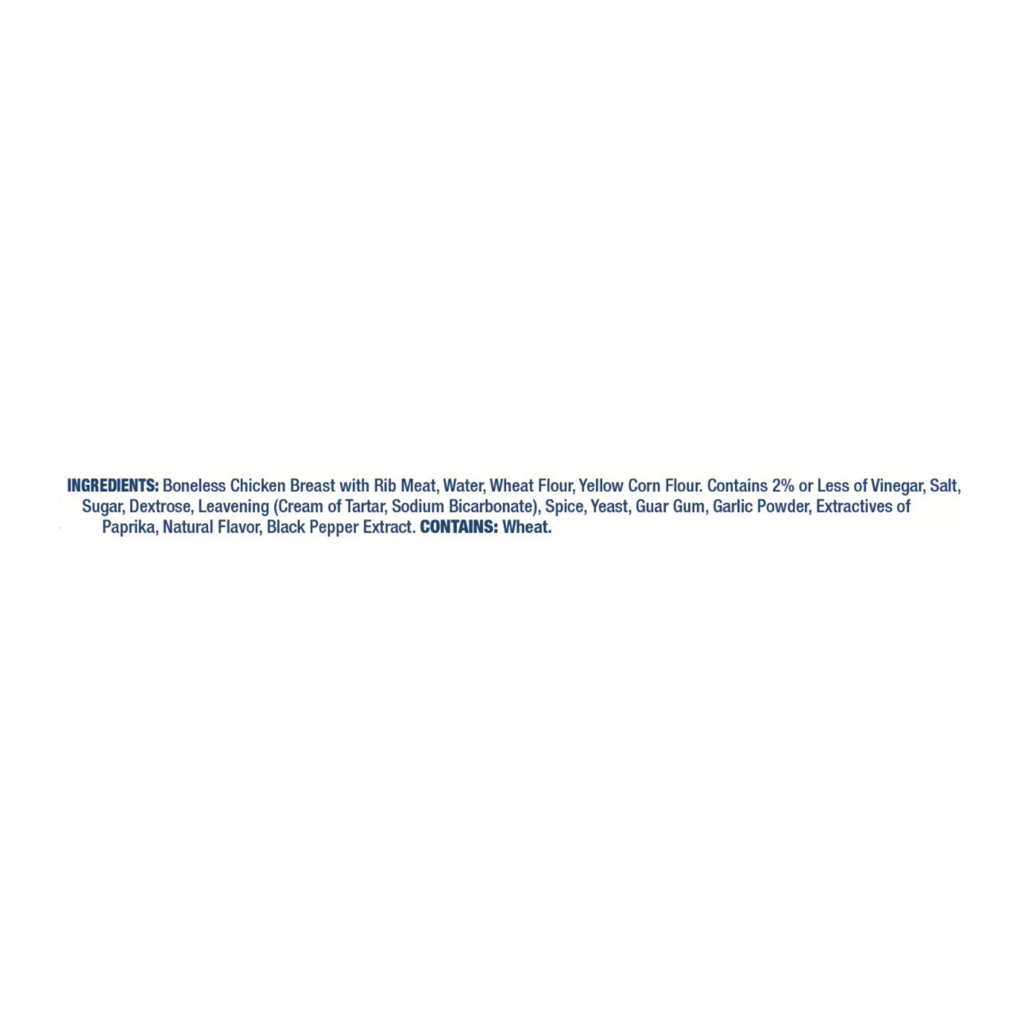 Ingredients: Boneless Chicken Breast with Rib Meat, Water, Wheat Flour, Yellow Corn Flour. Contains 2% or Less of Vinegar, Salt, Sugar, Dextrose, Leavening (Cream of Tartar, Sodium Bicarbonate), Spice, Yeast, Guar Gum, Garlic Powder, Extractives of Paprika, Natural Flavor, Black Pepper Extract.