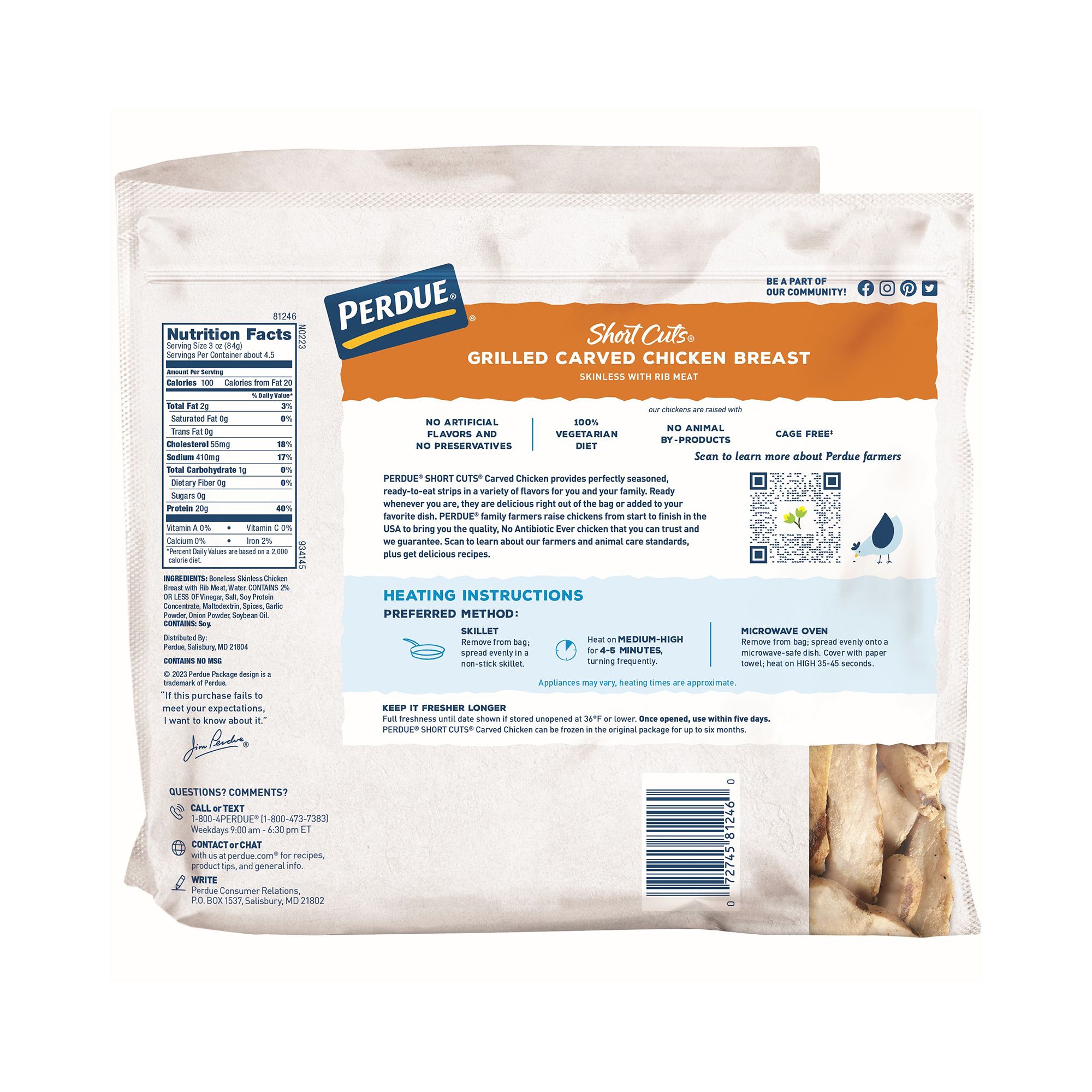 Delicious and ready when you are! Enjoy Perdue short cuts carved chicken breast for a delicious meal. Trust the quality and convenience of Perdue chicken. It's raised with no antibiotics ever, perfectly seasoned and ready in minutes for any recipe. Whether you eat them right out of the bag, or add them to your favorite salad, wrap, or pasta, these chicken strips will never disappoint. If you're hungry for chicken that's raised better, you're hungry for Perdue.