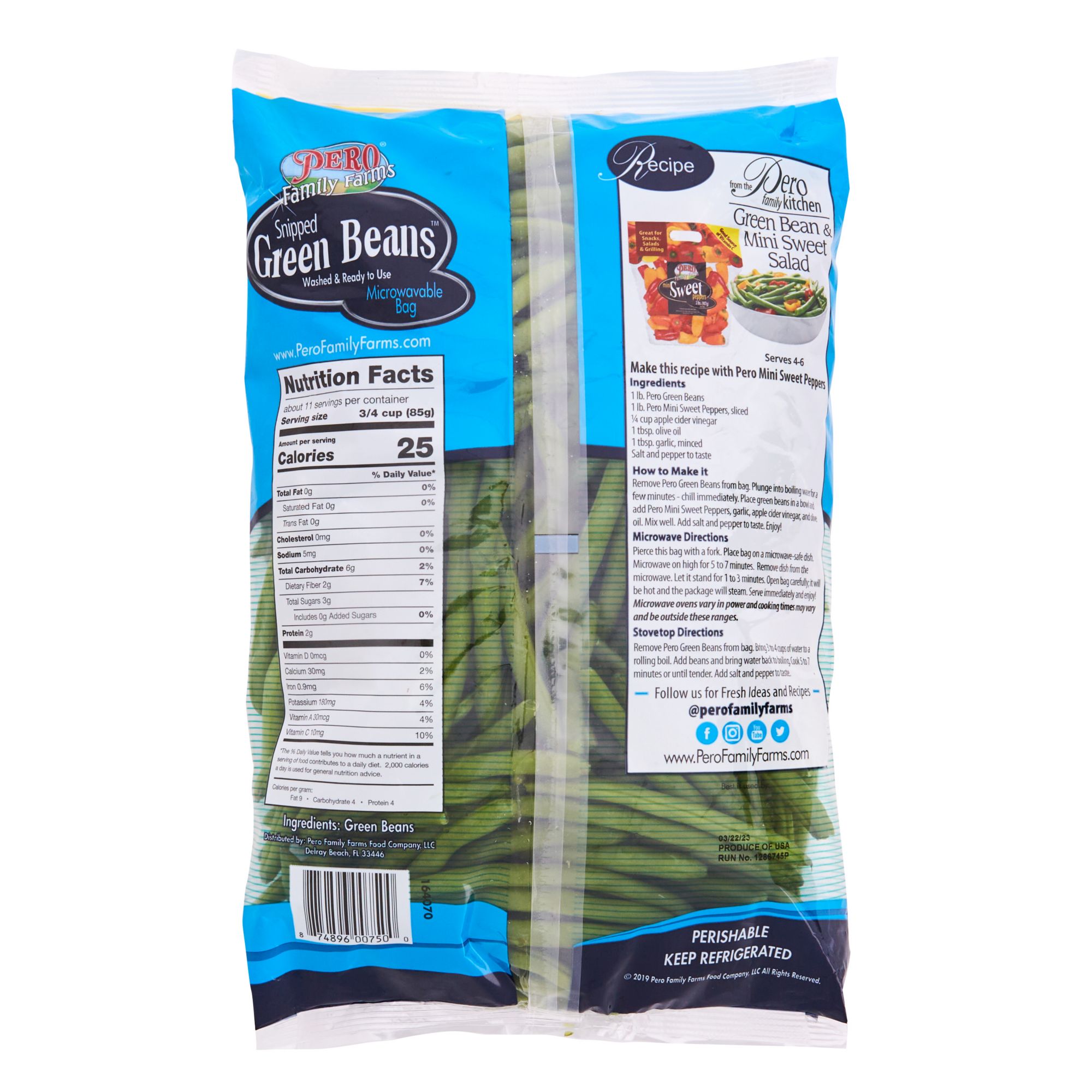 Microwavable bag makes serving easy All of the beans are washed and ready to serve Includes 2 lbs. of Pero Snipped Green Beans