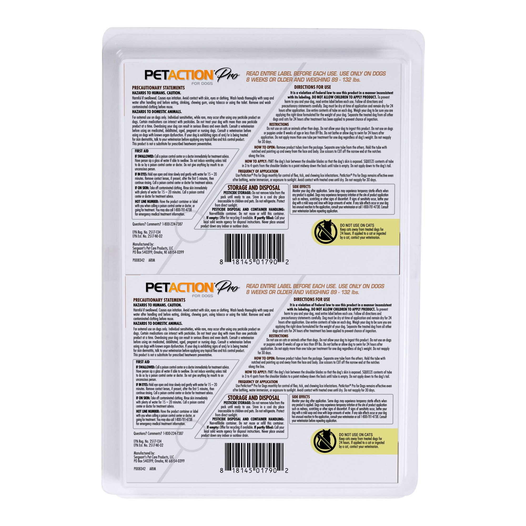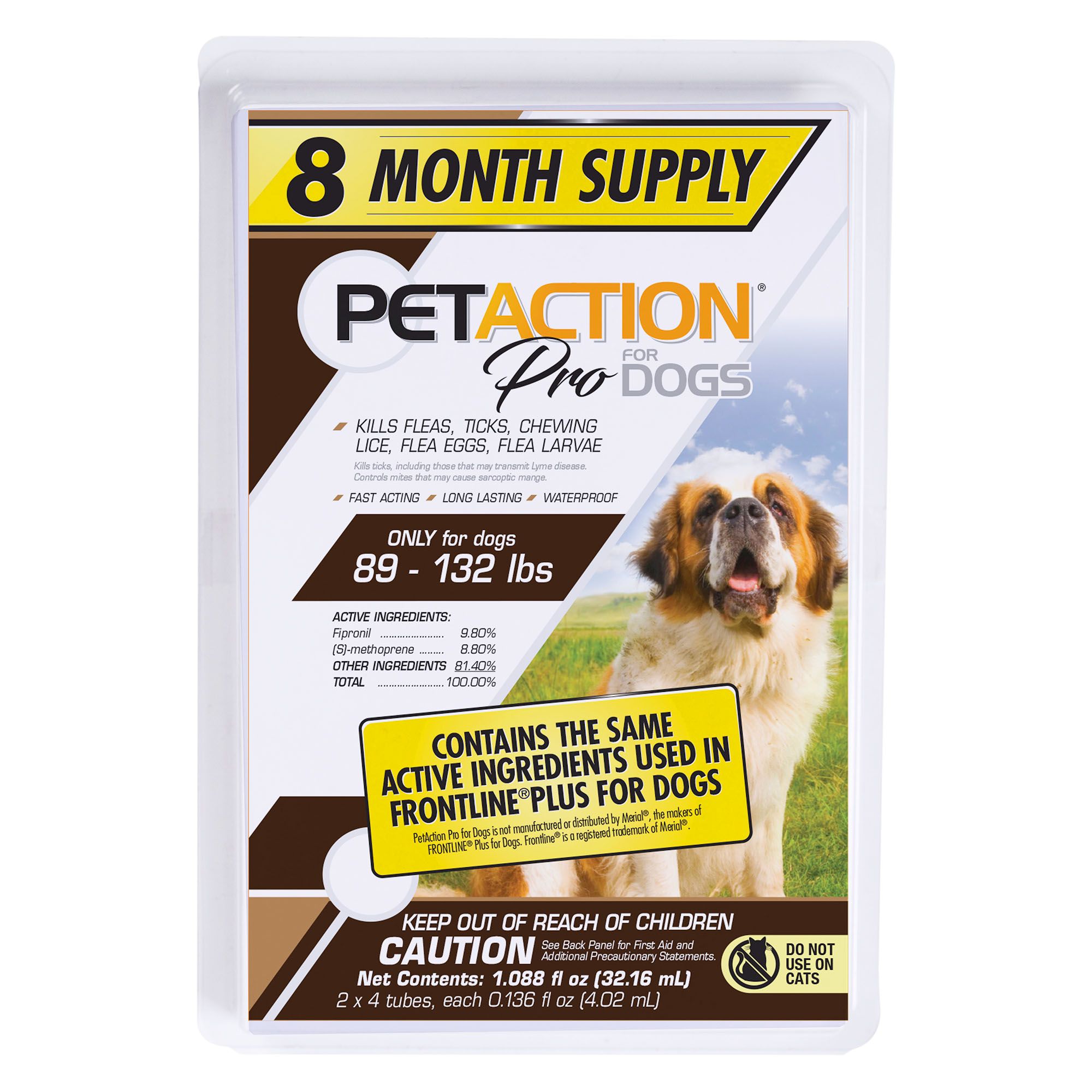 Contains the same active ingredients Fipronil and (S)-methoprene found in FRONTLINE Plus for Dogs* PETACTION PRO for Dogs is a waterproof, monthly spot-on treatment and preventive that kills fleas, flea eggs and larvae, chewing lice, and ticks For dogs 8 weeks and older weighing between 89-132 lbs. Provides flea, tick, flea egg, and flea larvae protection, plus repels chewing lice for up to three months Allow product to dry for 24 hours before bathing or swimming Includes Pet Action Pro Flea & Tick Topical Treatment for Extra-Large Dogs, 8 doses