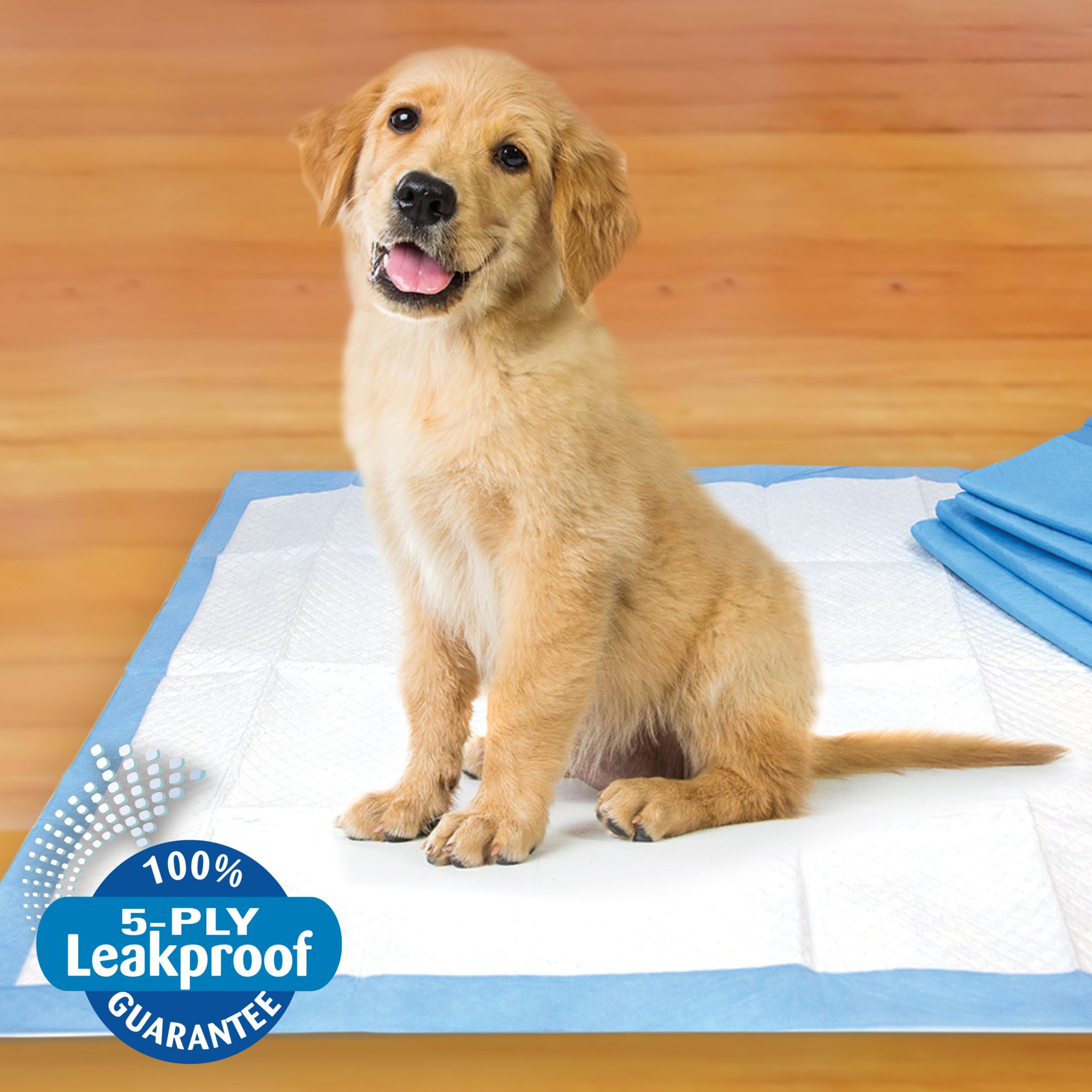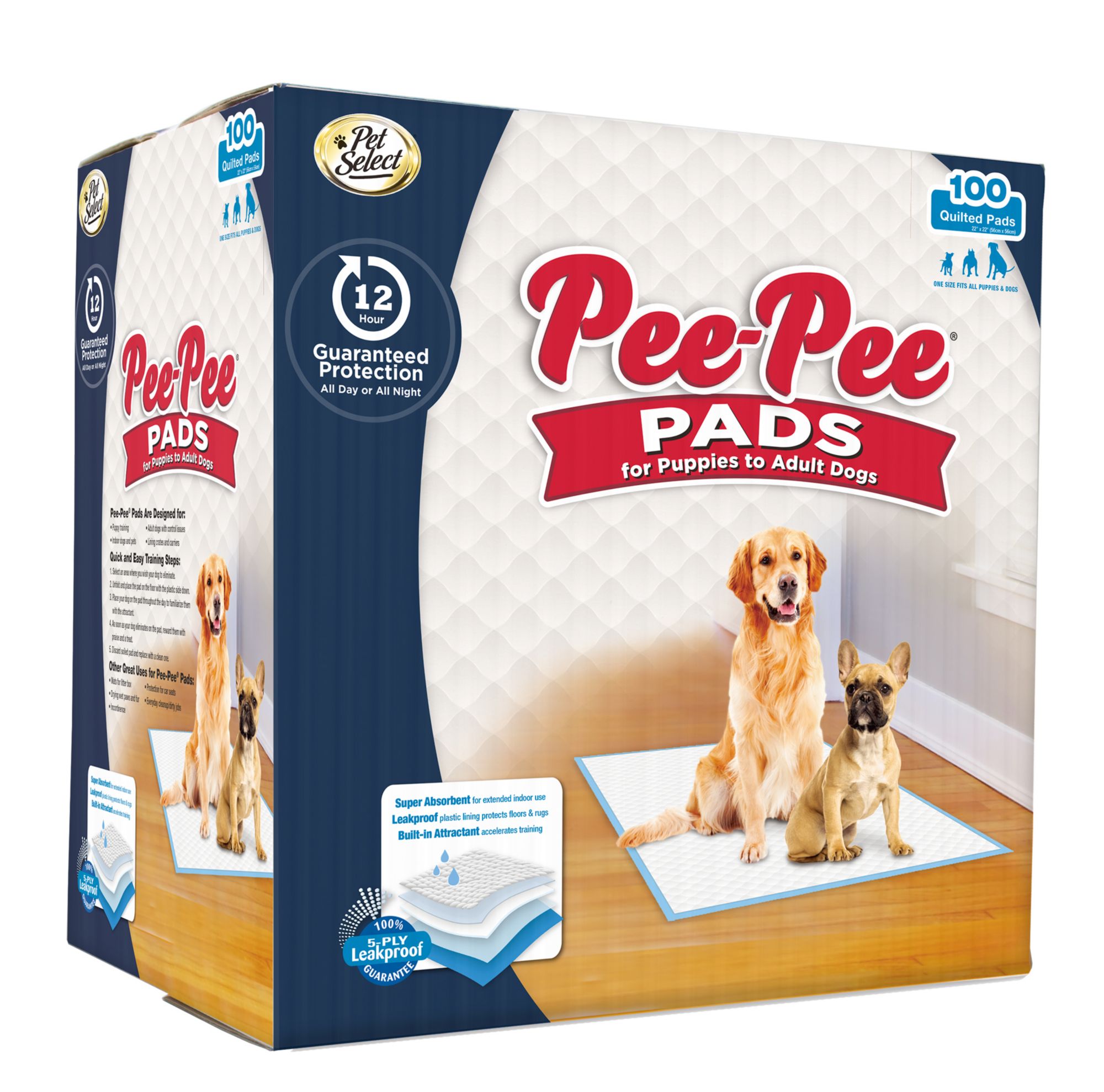 Pet Select Pee-Pee Pads use 5-layer technology to quickly absorb wetness and help control urine odor. The quilted top layer draws liquid into the absorbent core instantly, and the leak-proof liner provides all-day or all-night protection for your floor and can handle multiple wettings. The pads' built-in attractant helps naturally draw both puppies and adult dogs to potty in just the right spot.