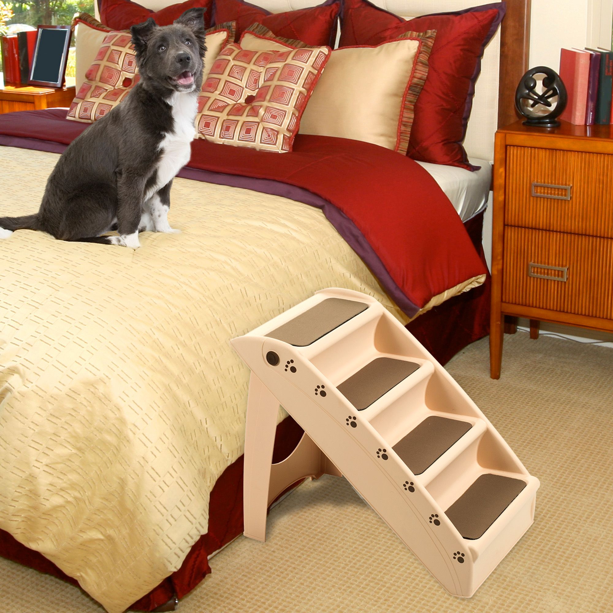 .Made of tough, durable plastic Easy-to-clean with a damp cloth and mild soap Built-in side rails keep your pet secure Non-slip foam pads protect your pet and your floors Adhesive back felt step covers give your pet better traction Snap lock feature keeps the steps from collapsing Great for indoor and outdoor use Includes 4-step folding pet stairs Warranty: 30 days