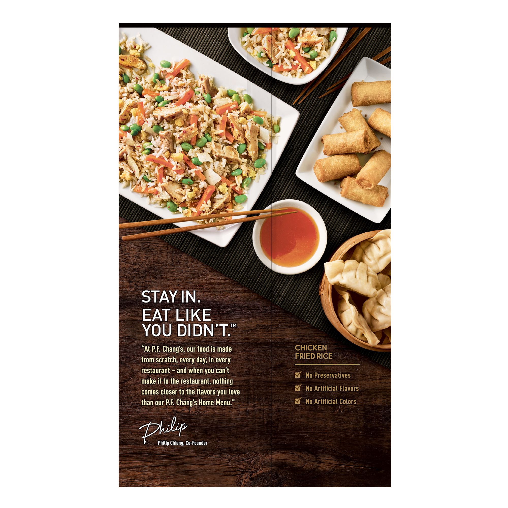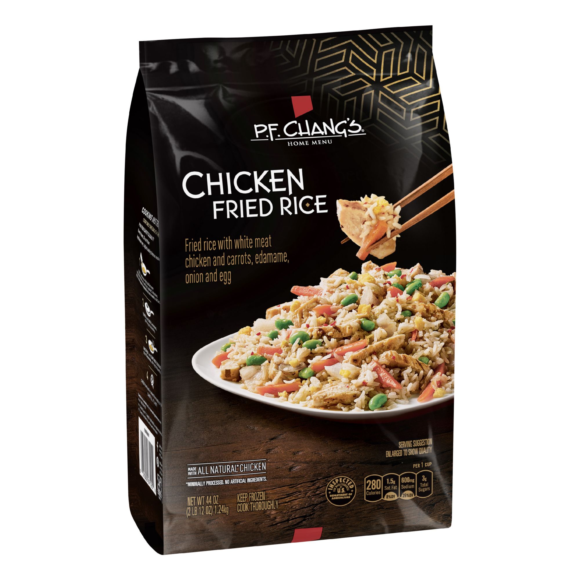 When you can't make it into the restaurant, stay in but eat like you didn't. When you want a simple meal at home but crave something special, P.F. Chang's Home Menu delivers restaurant-style Asian in minutes. Fried rice is paired with juicy white meat chicken, sweet carrots, savory edamame, onion, and egg. This 44 Ounce package contains one frozen P.F. Chang's Home Menu Chicken Fried Rice Skillet Meal --with 350 calories and zero grams trans fat per serving. Conveniently treat yourself to delicious, authentic Pan Asian flavor in the comfort of your own home. Simply prepare over the stove in a skillet and your meal is ready in minutes.