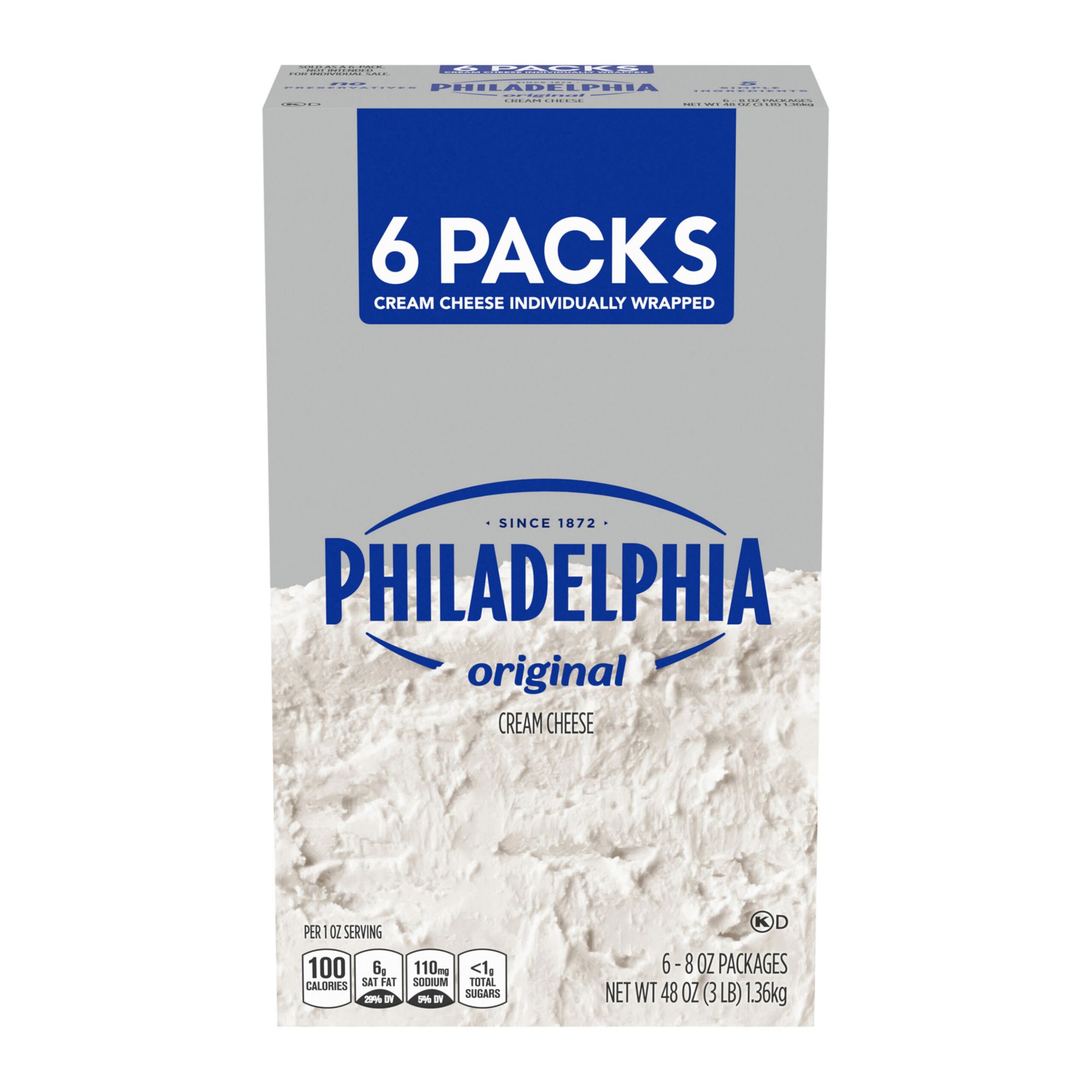 Philadelphia Cream Cheese is made with fresh milk and cream, and has been since they invented Philadelphia cream cheese in 1872. Their original cream cheese is made with five simple ingredients. It's perfect for making rich, creamy cheesecake for any get-together or occasion. Discover just how easy it is to make a cheesecake with Philadelphia. You can also try it for other delicious recipes like dips, appetizers and cream cheese frosting. Each box contains six eight-ounce original cream cheese blocks.